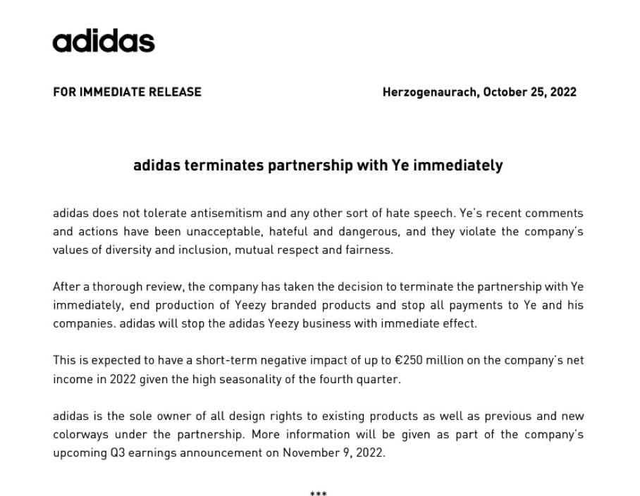 “After a thorough review, the company has taken the decision to terminate the partnership with Ye immediately, end production of Yeezy branded products and stop all payments to Ye and his companies. adidas will stop the adidas Yeezy business with immediate effect. adidas is the sole owner of all design rights to existing products as well as previous and new colorways under the partnership.”