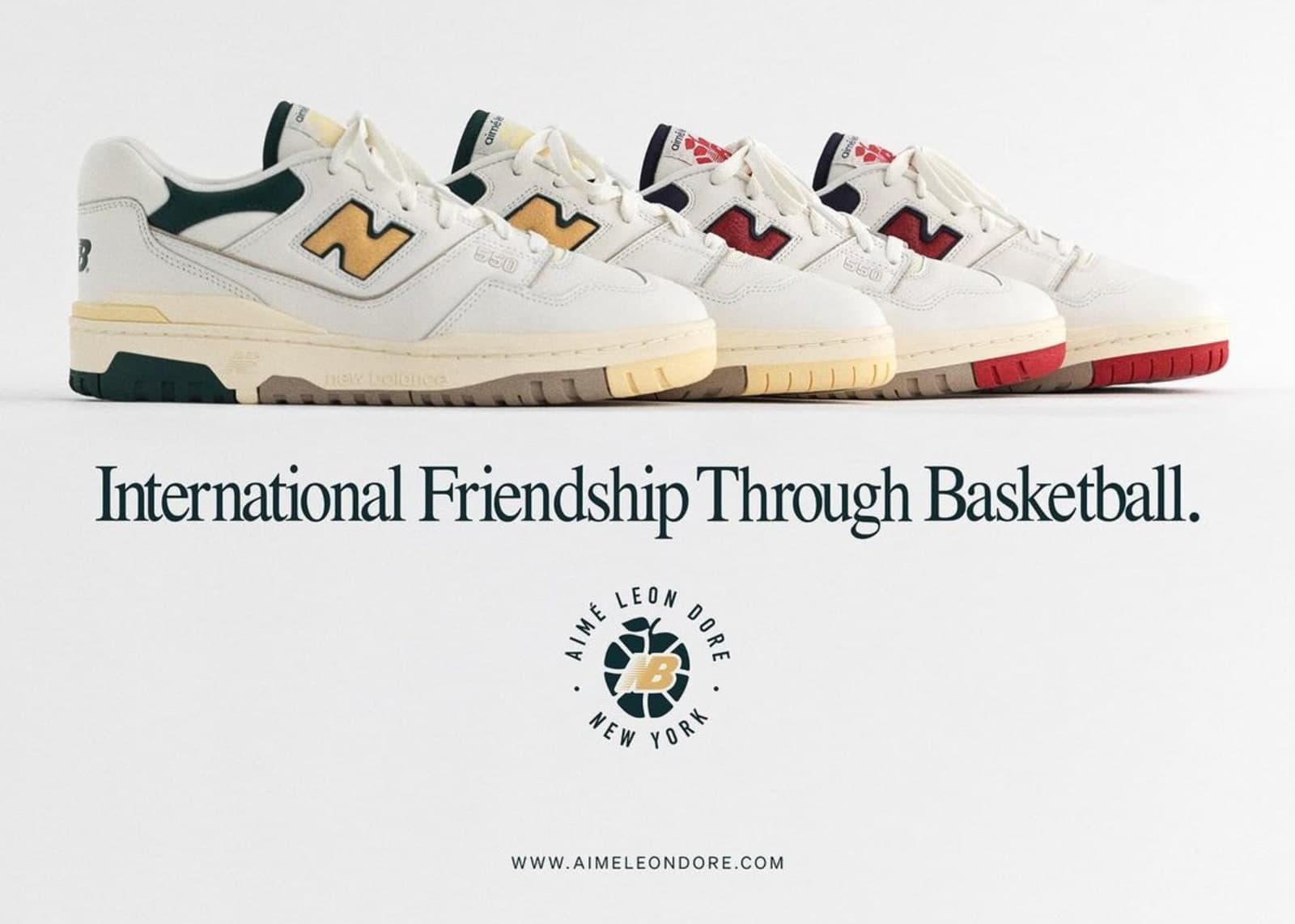 Aimé Leon Dore x New Balance 550’s nya collab är en minikapsel bestående av två färgställningar av silhuetten. De båda har en bas i vitt läder – men går i ”Grönt/Gult” respektive ”Rött/Marinblått”. Klassisk ”N”-branding syns på sidan av skon, samt på tungan och yttersulan.