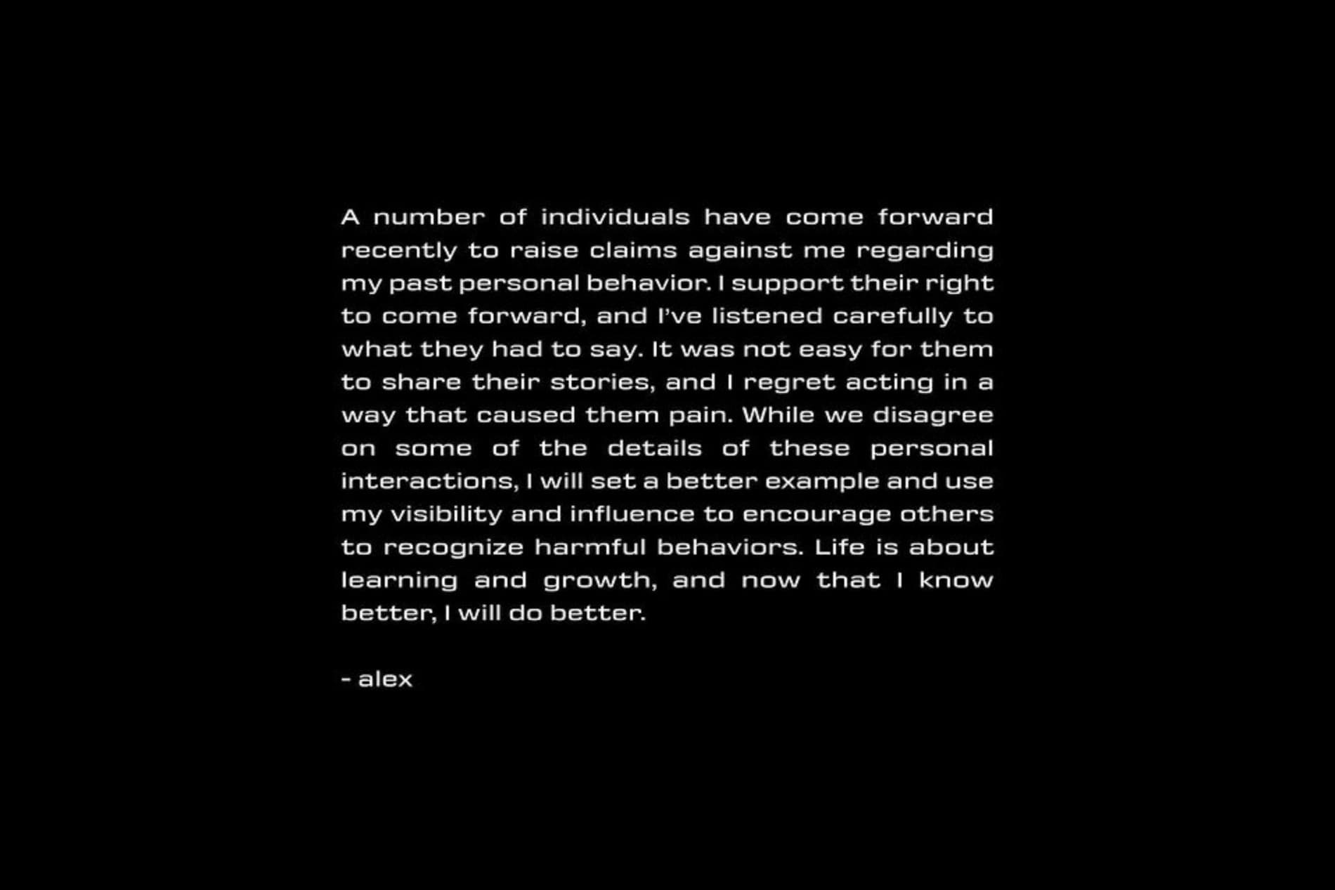 “A number of individuals have come forward recently to raise claims against me regarding my past personal behavior. I support their right to come forward, and I’ve listened carefully to what they had to say. It was not easy for them to share their stories, and I regret acting in a way that caused them pain. While we disagree on some of the details of these personal interactions, I will set a better example and use my visibility and influence to encourage others to recognize harmful behaviors. Life is about learning and growth, and now that I know better, I will do better.” skriver Wang på Instagram.