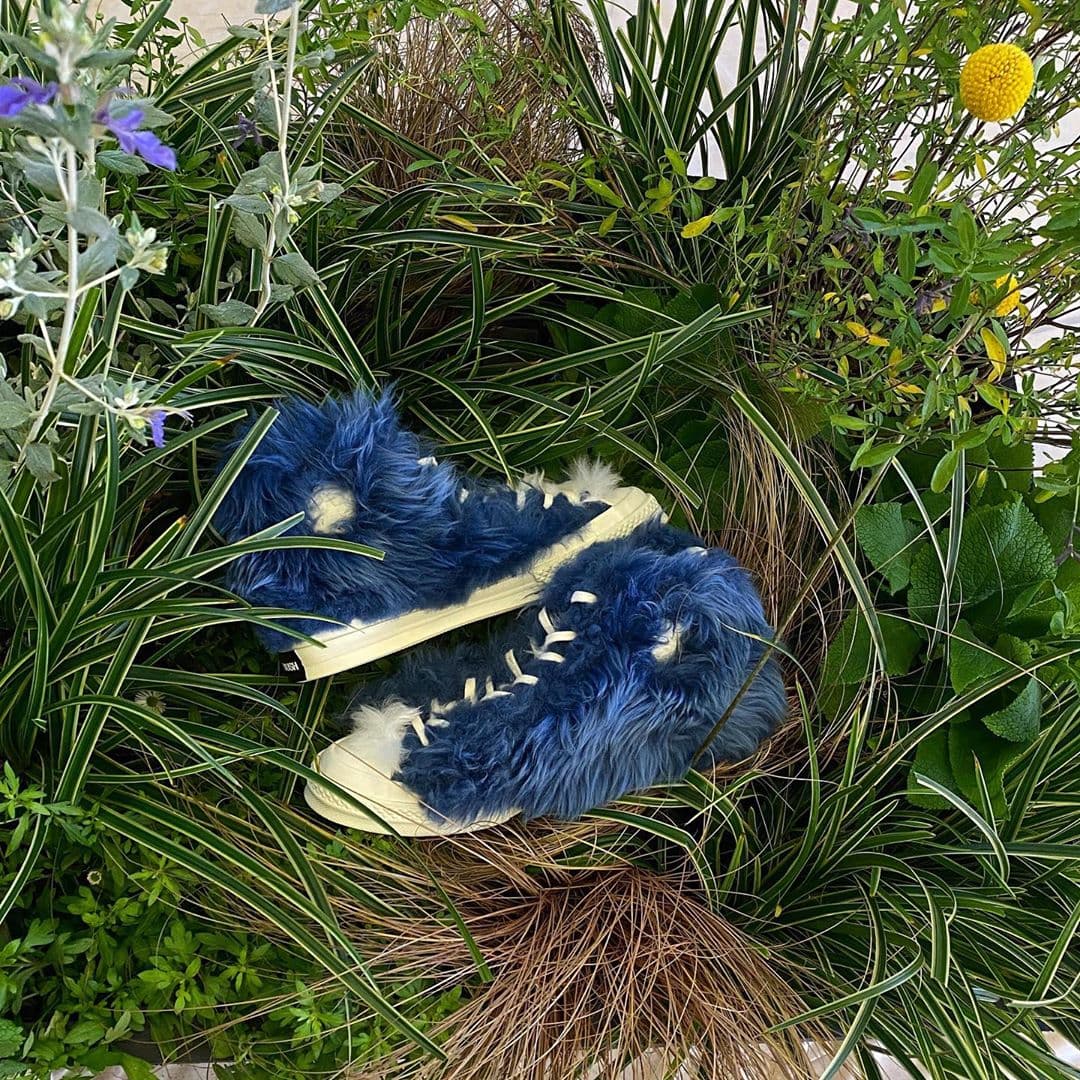 Converse Chuck Taylor All Star-modellen kommer i en ”Classic Blue” färgställning. Skon får en dramatisk och utstickande tolkning av den japanska designern då överdelen täcks av fluffig, blå fuskpäls. I pälsen kan vi urskilja en vit Converse-logga. Sulan kommer i vitt gummi, men saknar den utmärkande svarta randen. Hälen pryds av en svart AMBUSH-tag.