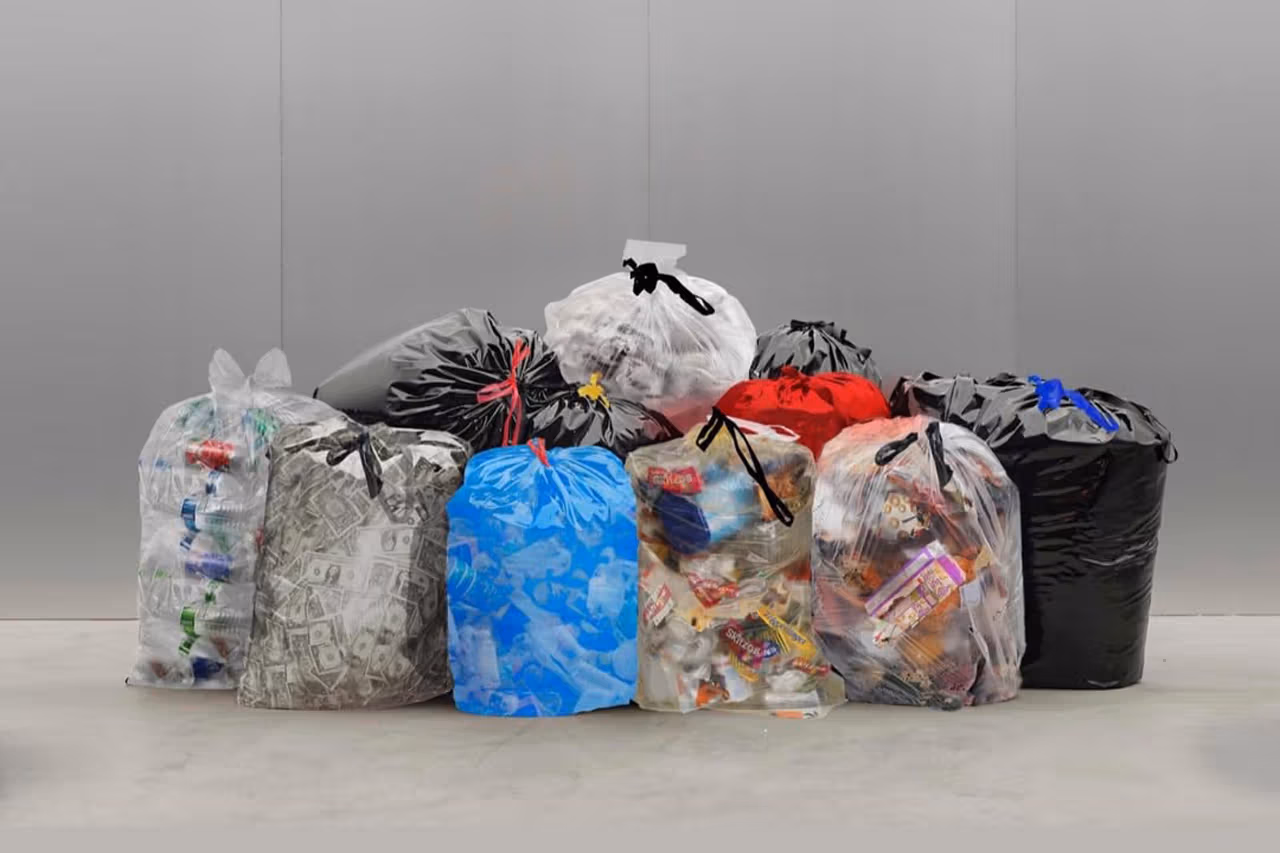 Soffan är ett samarbete med Crosby Studios och består av flera moduler som liknar genomskinliga, svarta, röda och blå sopsäckar. Men titta närmare: säckarna är fyllda med (tryckta) plastbehållare, skrynkliga sedlar och godispapper.