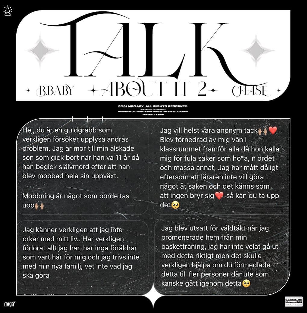 För del två av ”Talk About It” har B.Baby vänt sig till sina följare, för att kunna använda sin plattform åt att upplysa deras berättelser. Trots att ämnena är svåra att prata om är det exakt därför låten har skapats, för det är dags att våga ”talk about it”. I låten hörs berättelser om bland annat psykisk ohälsa, förluster och mobbning. Trots sin unga ålder bevisar B.Baby stor mognad och omtanke genom sin musik, något som blir tydligt i Talk About It-serien.