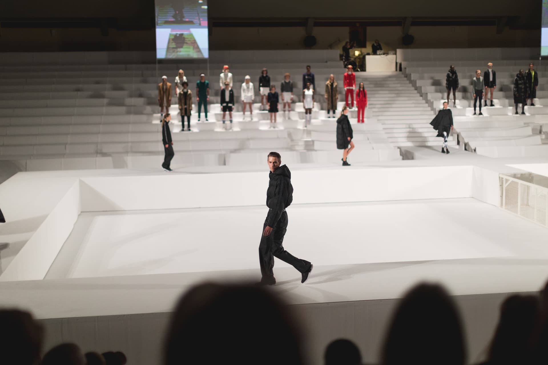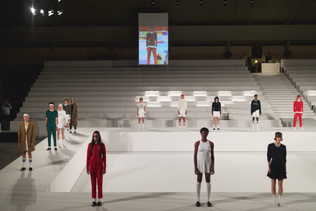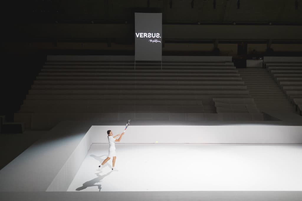 När vi kom in och slog oss ned på pressraden så är det första vi ser en ung grabb dressad topp till tå i Björn Borg som stod & spelade tennis, mitt i den enorma lokalen på en bländande vit tennisbana. Ett underhållande sätt att hålla sina gäster nöjda innan den faktiska showen startade.