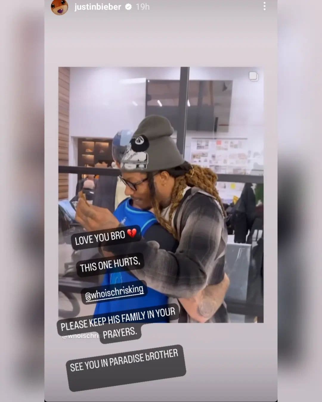 ”Älskar dig bror. Det här gör ont. Tänk på hans familj under denna svåra tid. Ses i paradiset broder”, skrev Justin Bieber på en Instagram Story.