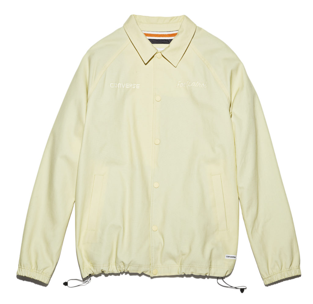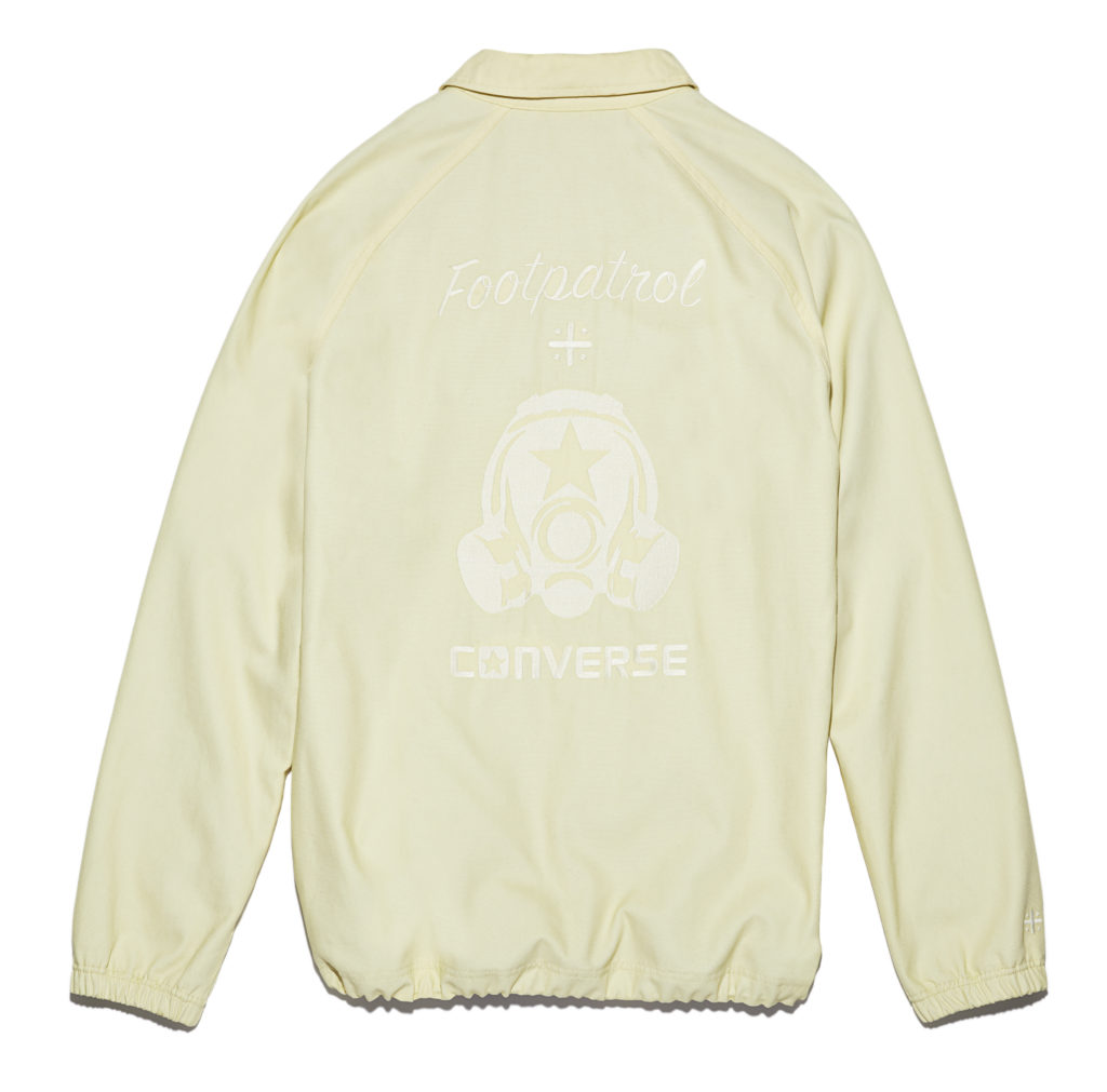 Converse One Star x Footpatrol sneakern har en ovansida klädd i mocka och Sohos unika trottoarskantsmärken är broderade på sula och utsida. Coachjackan är i 100 % canvas och har i likhet med sneakern trottoarskantsmärkena inbroderade på den högra armen.
