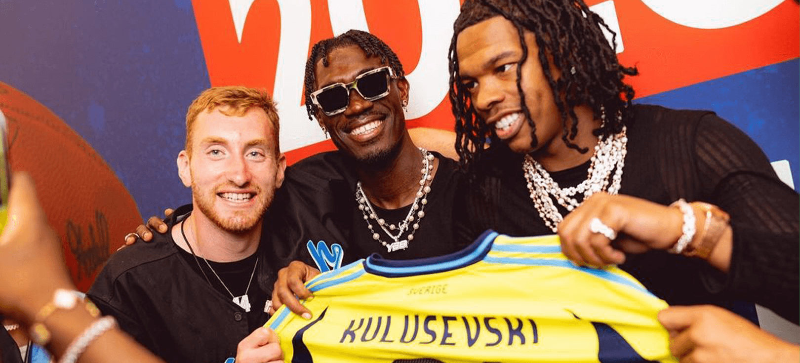 Dejan delade med sig av bilder från eventet där trion syns backstage, men även med Lil Baby där de håller upp en Sverigetröja med ”KULUSEVSKI” och nummer 21 på ryggen.
