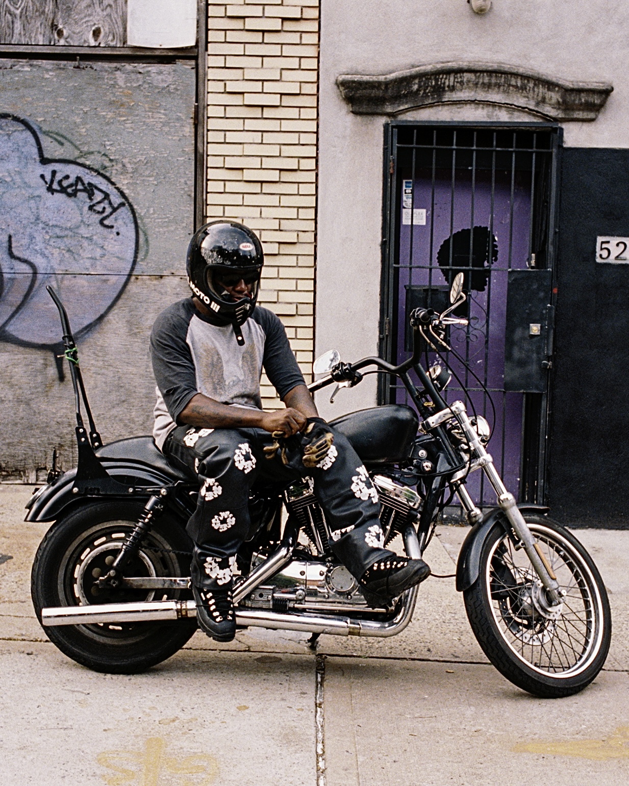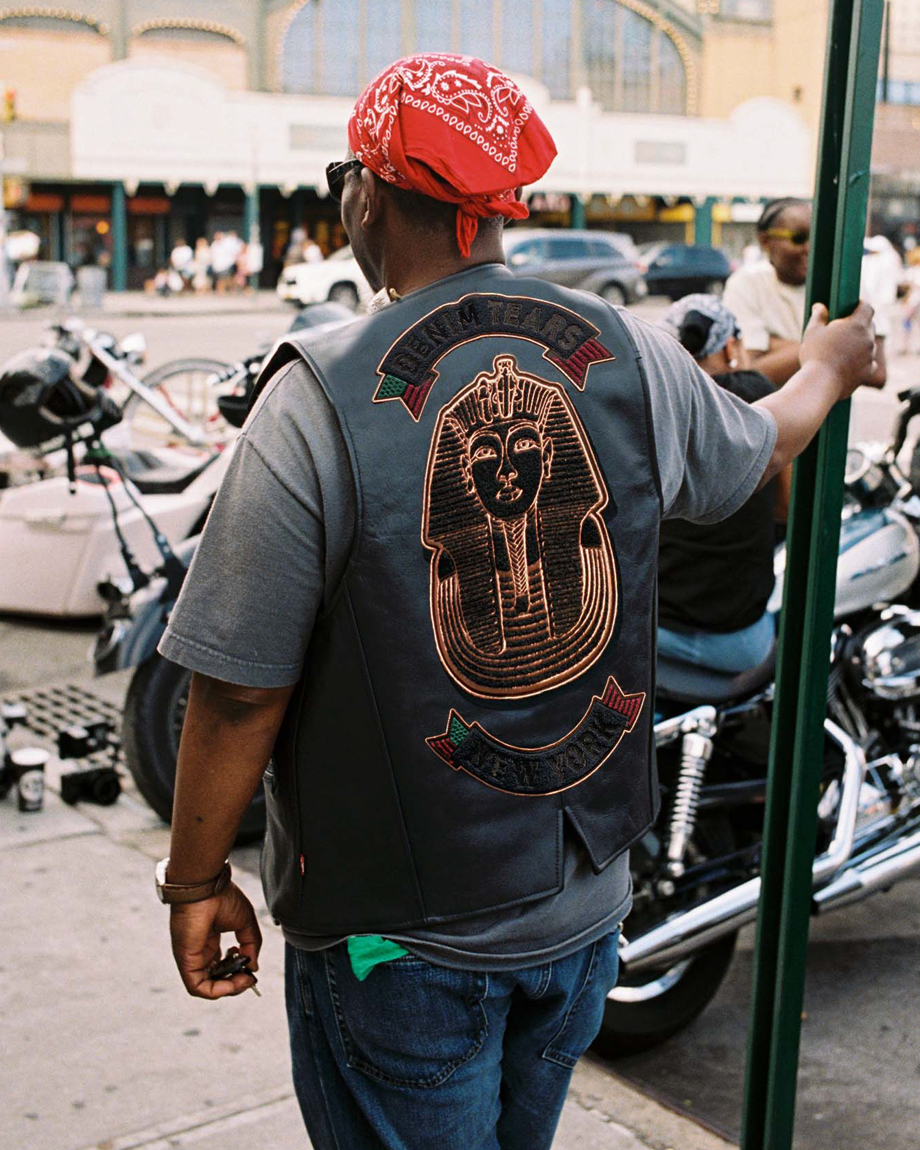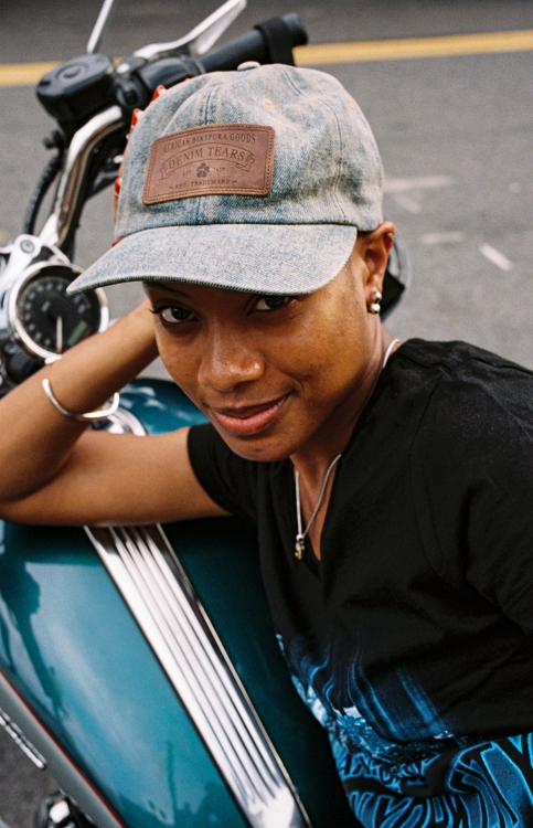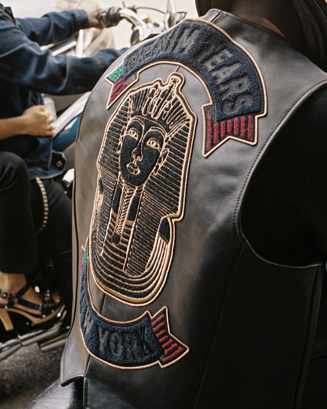 Den tillhörande kampanjen visar verkliga medlemmar från det svarta biker-communityt, fotade i tillsammans med motorcyklar på platser från deras vardagliga liv. Kollektionen innehåller staples från kulturen, bland annat en Leather Cotton Wreath Type III Jacket, tillverkad av italienskt premiumläder och med ett heltäckande tryck av Denim Tears ikoniska bomullskransmotiv, som även syns på de matchande läderbyxorna. Jackan har även en mocka-patch med en kombinerad logga och hällor som knyter an till traditionella motorcykelmönster.