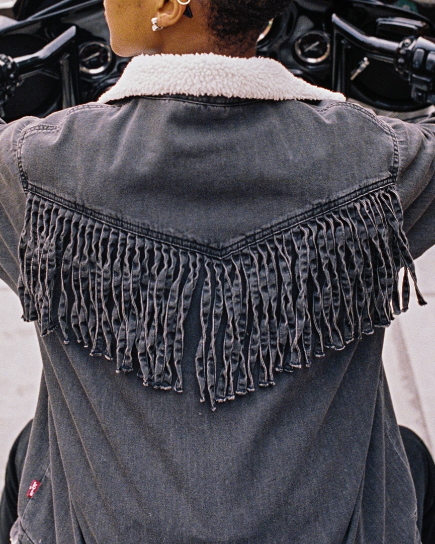 Vi ser även två klassiska silhuetter, ett par Western Stitch 501-jeans, som firar sitt 150-årsjubileum 2023, med en matchande Western Stitch Denim Shirt. Båda plaggen kommer i sliten indigo och har broderade westernmotiv längs armarna, över ryggen och på utsidan av varje ben. Dessutom finns en Western Cowboy-skjorta i sliten svart denim med sherpakrage, fransdetaljer och lädersnörning upptill som passar bra när vinden viner kallt ute på vägarna.