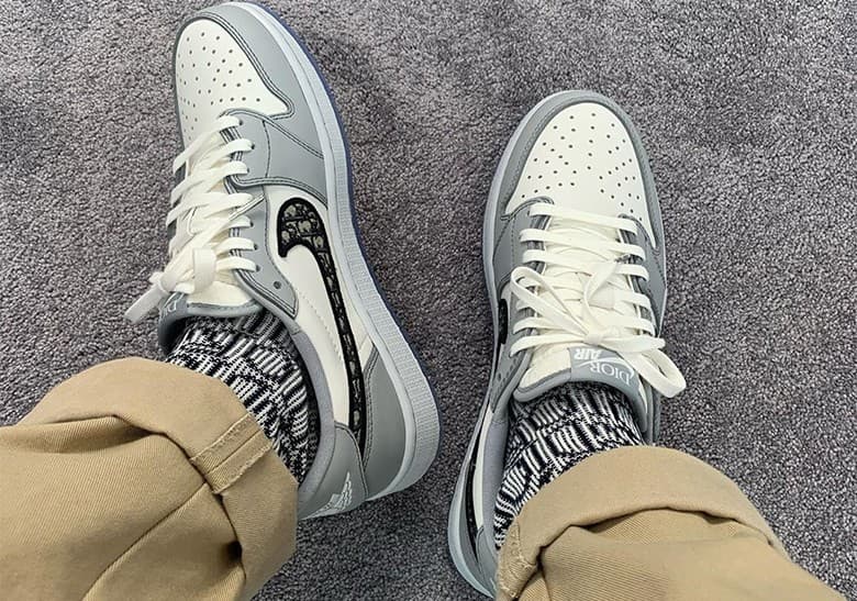 Nu får vi för första gången se bilder på en ryktad Dior x Air Jordan 1 Low modell. Likt high-top modellen ryktas även den låga versionen komma i en grå/vit färgställning med handmålade kanter. Även på denna modell får vi se Swoosh-logotypen i jaquard med det ikoniska Dior Oblique-mönstret.