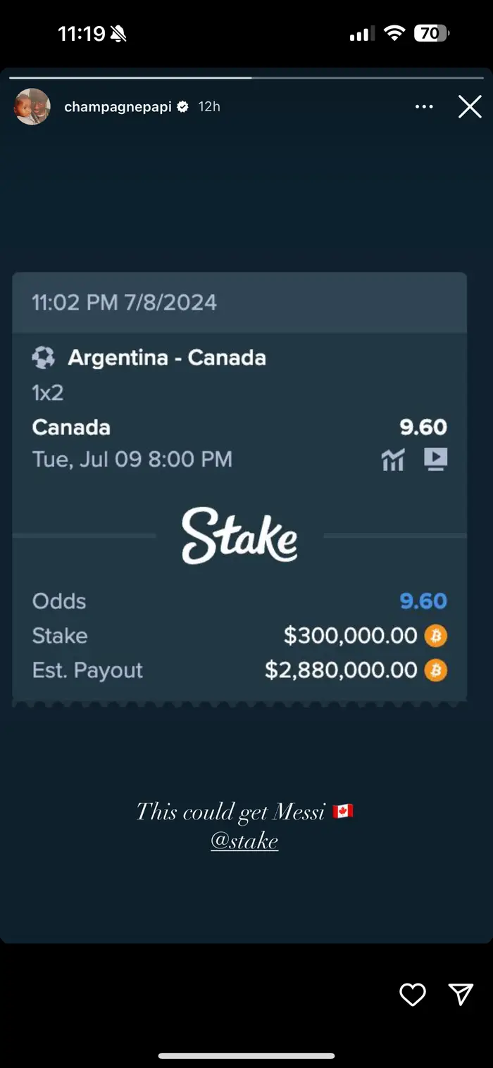 Superstjärnan har hållit låg profil sedan han förlorade beefen mot Kendrick Lamar, som nu är på ett segervarv med ”Not Like Us”. Han har istället fokuserad på sin betting, då han sedan en längre tid tillbaka arbetar nära med bolaget Stake. Inför Kanadas match mot Argentina la han en enorm chansning på sitt hemland, då han satsade över 3 miljoner kronor på att Kanada skulle gå vidare.
