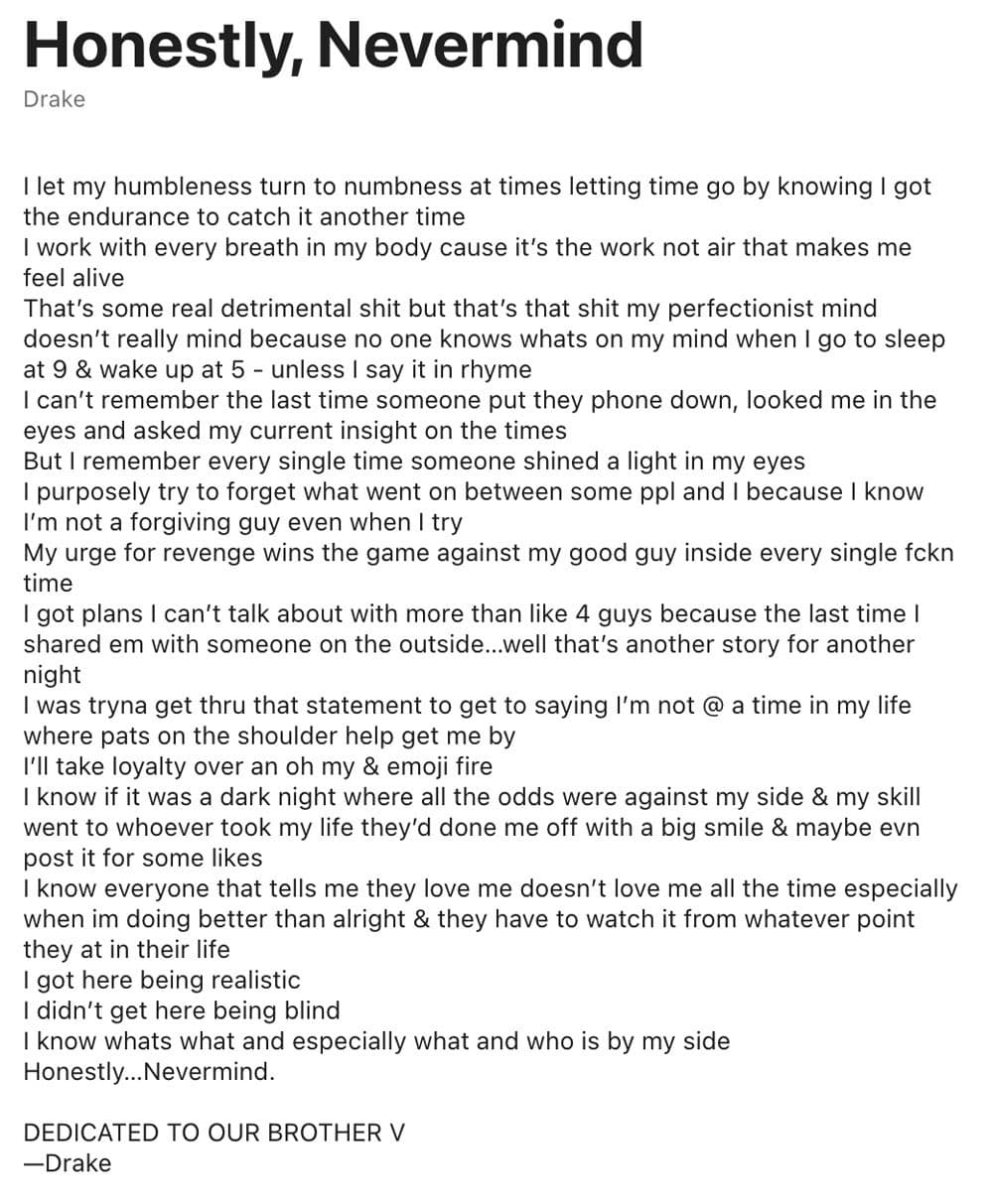 Drake berättar att Honestly, Nevermind är dedikerat till den bortgångne vännen och designern Virgil Abloh. Detta delar han i ett uttalande på sociala medier: