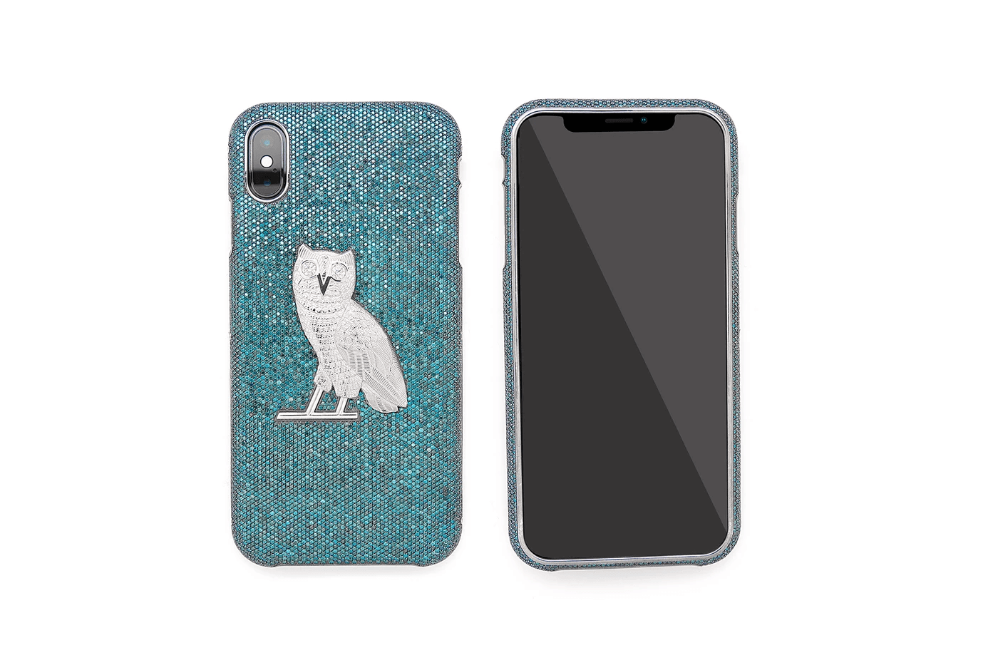 Iphone-skalet består av 18k vittguld och över 80 Carat i vita och blåa diamanter. I mitten på skalet ser vi signatur OVO ugglan där två stora diamanter formar ugglans ögon.