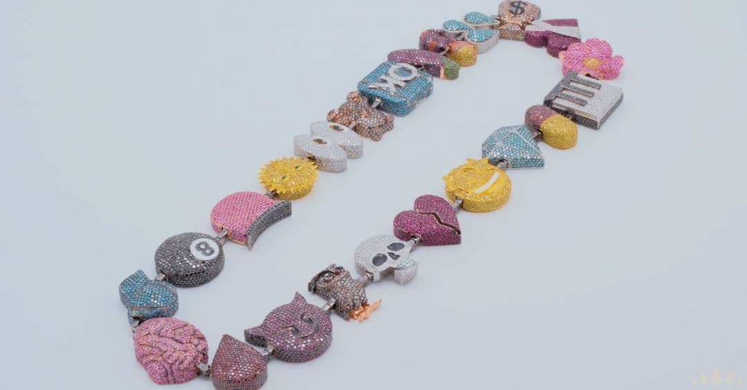 Kedjan består såklart av en Certified Lover Boy emoji – men vi ser även andra symboler som är utmärkande för rapparen. Däribland ugglan, pianotangenter, en nalle, en keps, pengar, en 8-ball samt ett lagat hjärta. Dessutom ser vi några mer explicit som en aubergine, ögon och en djävul.