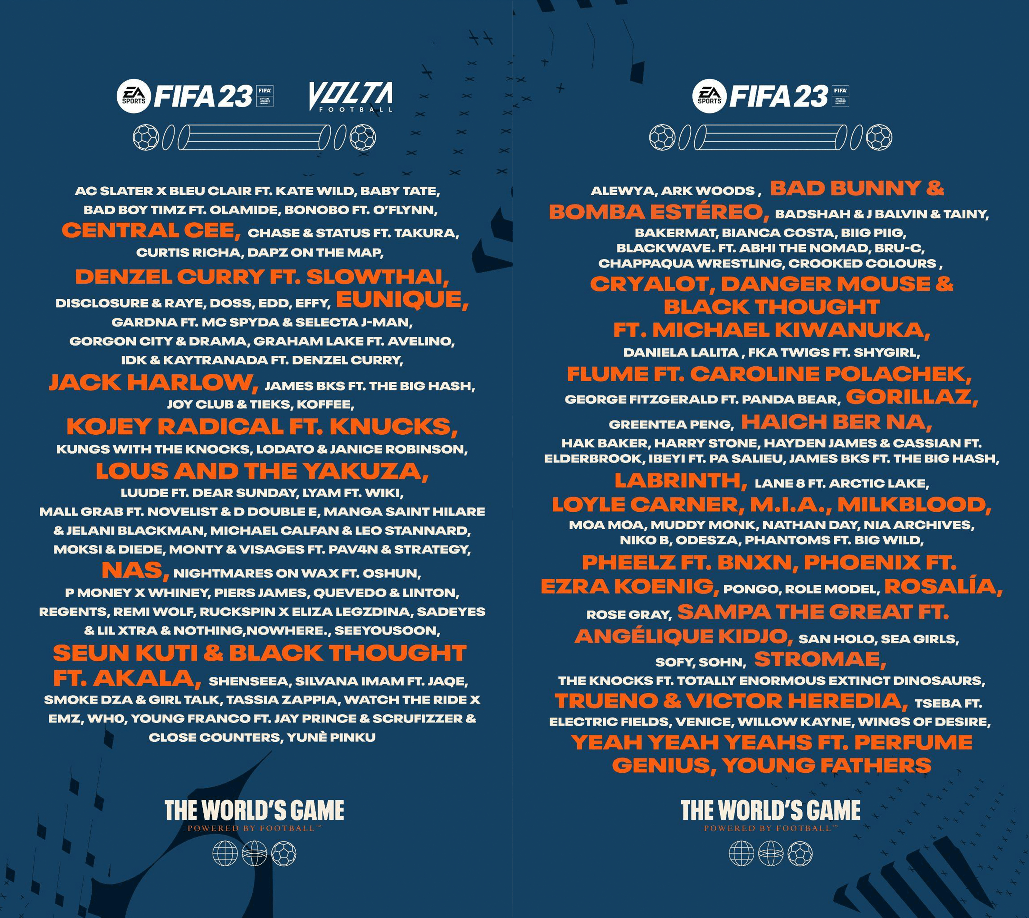 Med över 100 låtar från en stor blandning artister, mixar FIFA 23-soundtracket genrer och samlar röster från hela världen. Den omfattande låtlistan visar upp en rad globala namn, som Bad Bunny och Yeah Yeah Yeahs, såväl som nykomlingar som Baby Tate, Ibeyi och Pheelz.