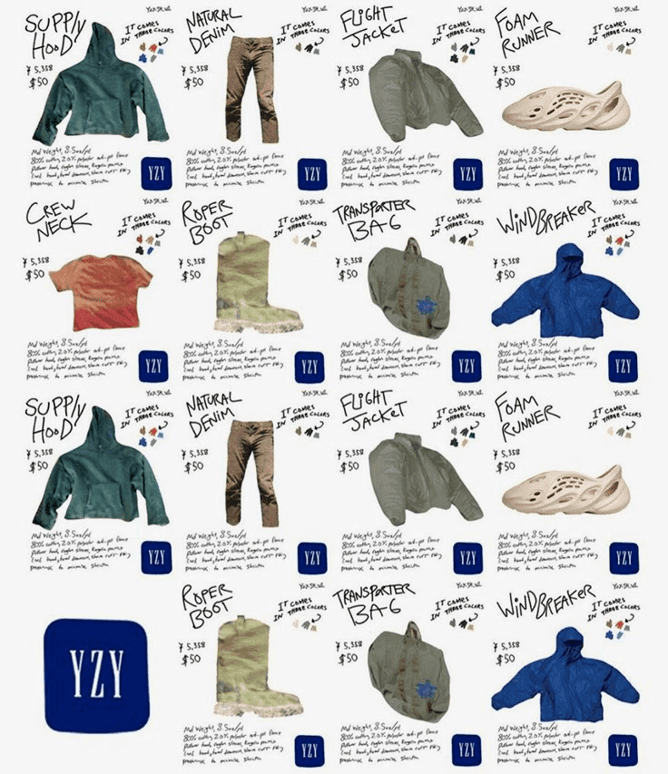 Ännu vet vi inte exakt vad linjen kommer inkludera. Dock har flera fans samlat olika plagg som skulle kunna vara en del av kollektionen. De kommer från olika bilder, koncept och samples som Mr.West delat på Twitter. Kanske kan vi vänta oss jordnära toner och basplagg? Det återstår att se.