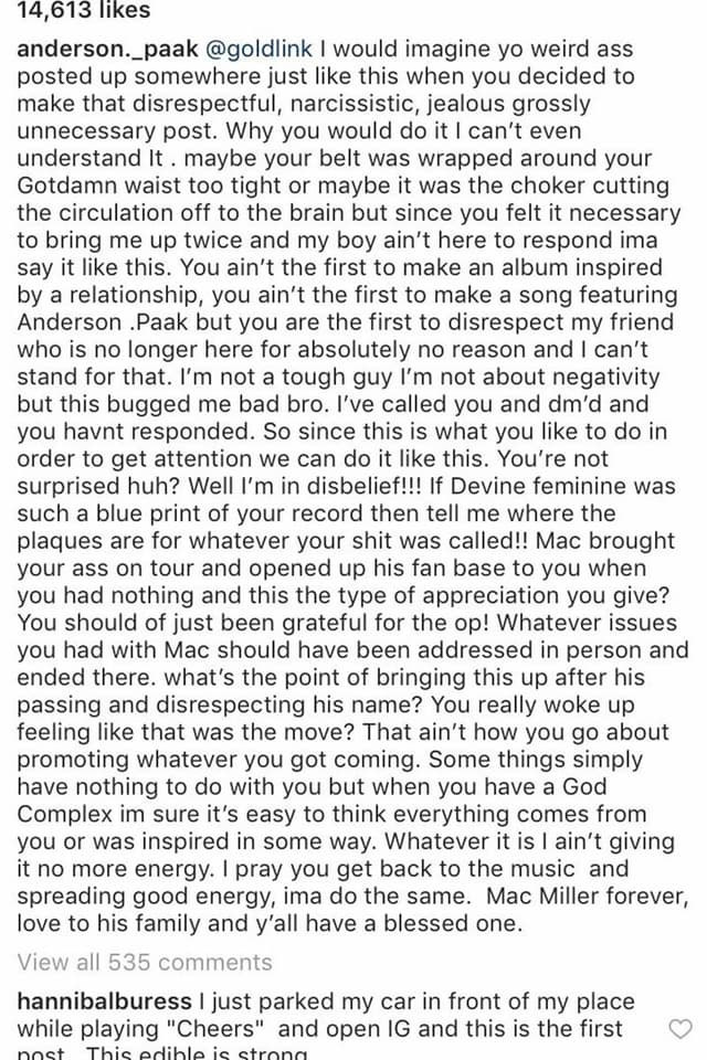 Anderson .Paak som var en god vän till Mac och gästade även Divine Feminine albumet. Anderson .Paak nämns i Goldlinks inlägg och har enligt en bild från Complex sagt att Goldlinks inlägg är ”respektlöst, narcissistiskt, svartsjukt och onödigt.” I det nu borttagna inlägget skriver Anderson .Paak även;