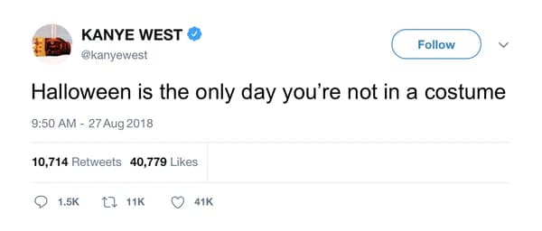 Med tanke på ovanstående tweet blev Kanye ”Ye” Wests val att klä ut sig till dinosaurien Dino (heltäckande dräkt) år 2019 extra rolig. När hela familjen, inklusive dåvarande frun Kim Kardashian, klädde ut sig till Familjen Flintstone kändes det självklart att Ye skulle vara pappan Fred. I typisk Ye-stil gick han dock emot alla förväntningar när han istället klädde ut sig till familjens husdjur: En lila dinosaurie.