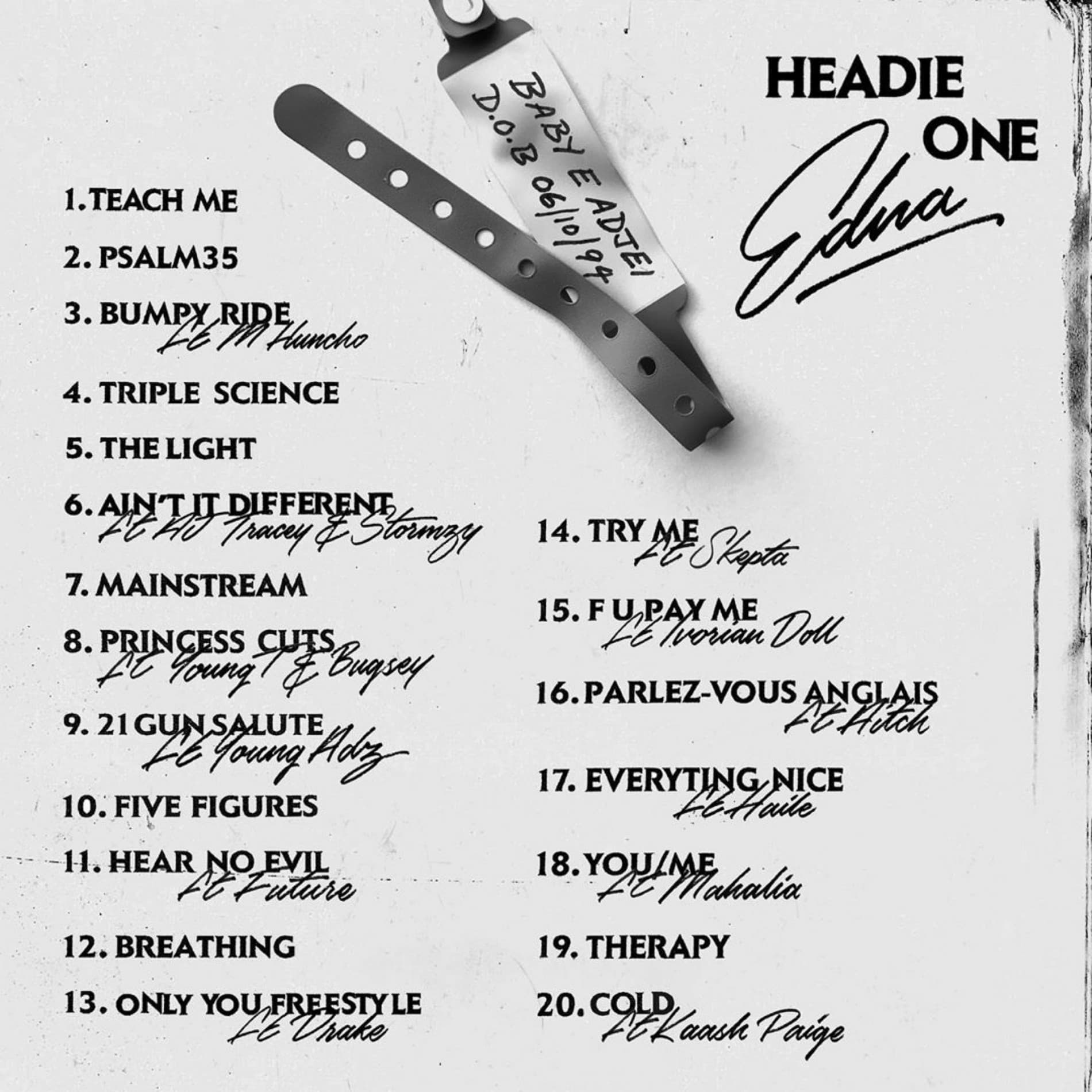 Hans första studioalbum Edna får flera spännande gästinhopp. Vi hör stora namn från UK-scenen som M Huncho, AJ Tracey, Stormzy, Young T & Bugsey, Young Adz, Skepta, Ivorian Doll, Aitch, Haile och Mahalia. Dessutom tar han ett steg ut på den internationella scenen med gästerna Future, Drake och Kaash Paige. Titeln är en hyllning till hans mor Edna Duah som gick bort 1998 när Headie var bara tre år. Det berättade han om i en intervju med 16BARS: