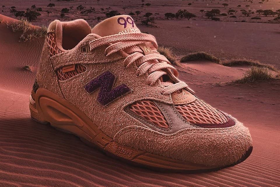 Paret kommer, precis som dess företrädare, i mocka, med kontrasterande meshtyg för den klassiska NB-känslan. Salehe har döpt just denna modell till ”Sand Be the Time”, vilket representeras väl med den varierande beige-rosa färgen som dominerar skorna i dess helhet. Undantagen kommer på dess N-logga samt på andra detaljer som färgas i ett oväntat men allt så passande lila. Med tanke på den rosa-lila färgen på himlen och beigea färgen på sanden i skornas reklamfilm, som dessutom gästas av Thundercat, kan man tydligt se var inspirationen kommit från.