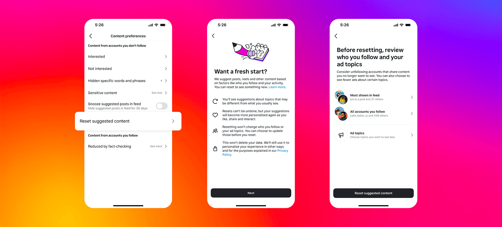 Uppdatering gör det möjligt att blanka de innehållsrekommendationer som appen byggt upp för dig. Appens algoritm är skapad för att anpassa sig efter dina nuvarande intressen, vilket gäller på explore page och reels samt feedet på startsidan, som i folkmun ibland kallas din ”for you page” likt den på konkurrenten TikTok.