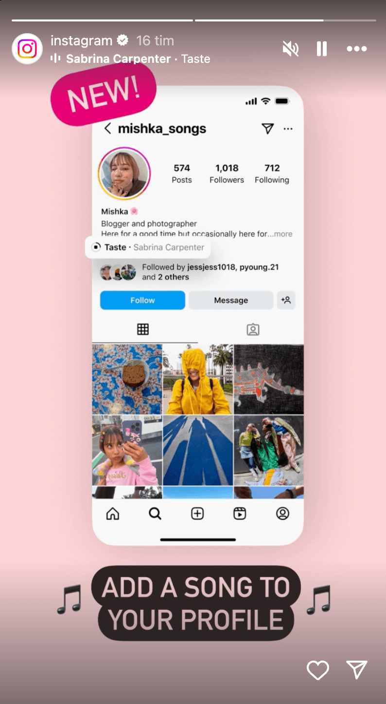 Nu är din favoritlåt på din profil. Enligt en skärmdump som Instagram delade på sin story kommer låten visas under en liten play-symbol nedanför din bio. I detta fall är det Sabrina Carpenters ”Taste” som valts, och både titel och artist syns i profilen.
