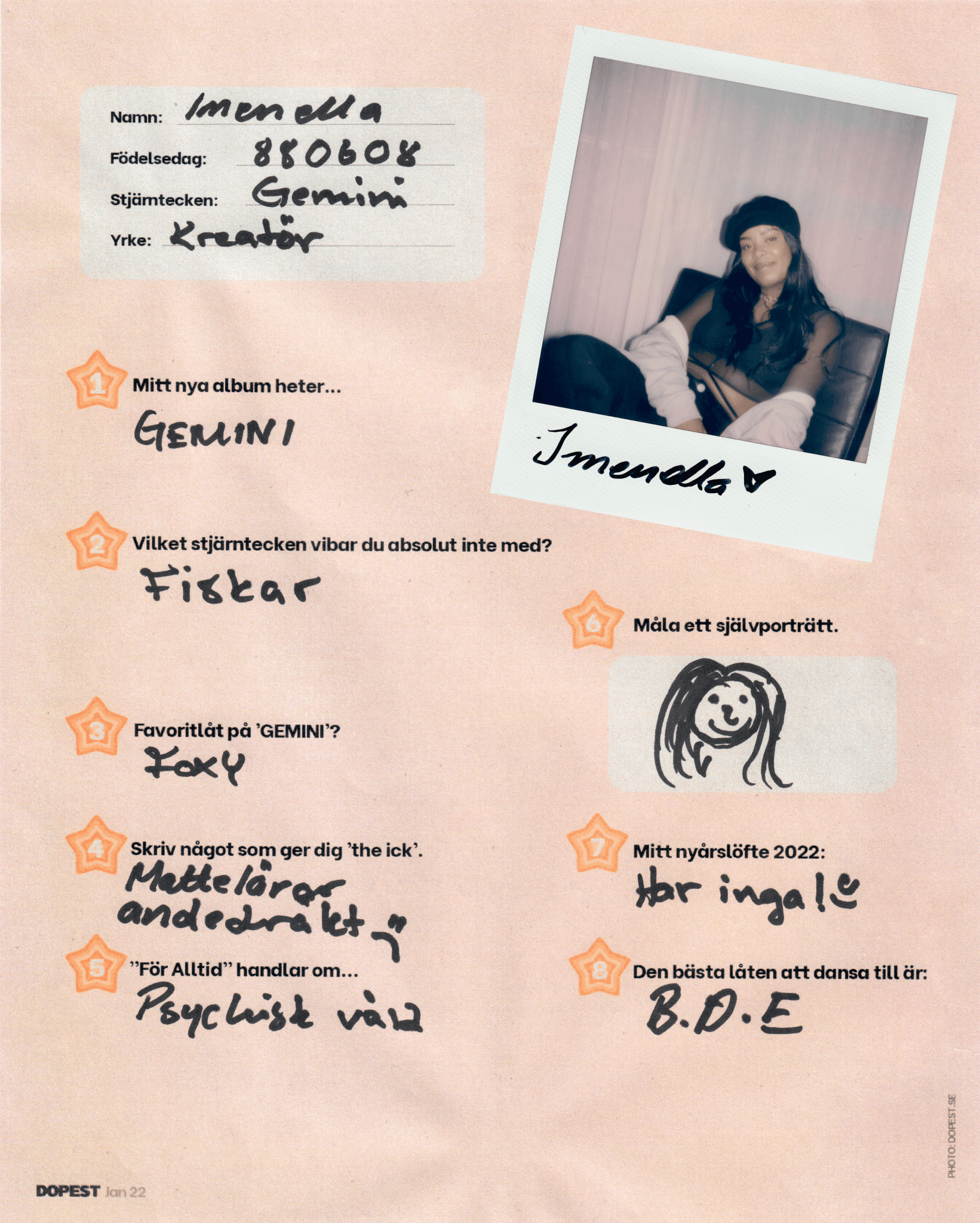 Efter pandemins ovisshet har Imenella hunnit återhämtat sig, och är redo att kliva ut i rampljuset igen. Med debutalbumet Gemini vill hon dela med sig av de lärdomar hon fått genom åren – på ett sårbart och ärligt vis.