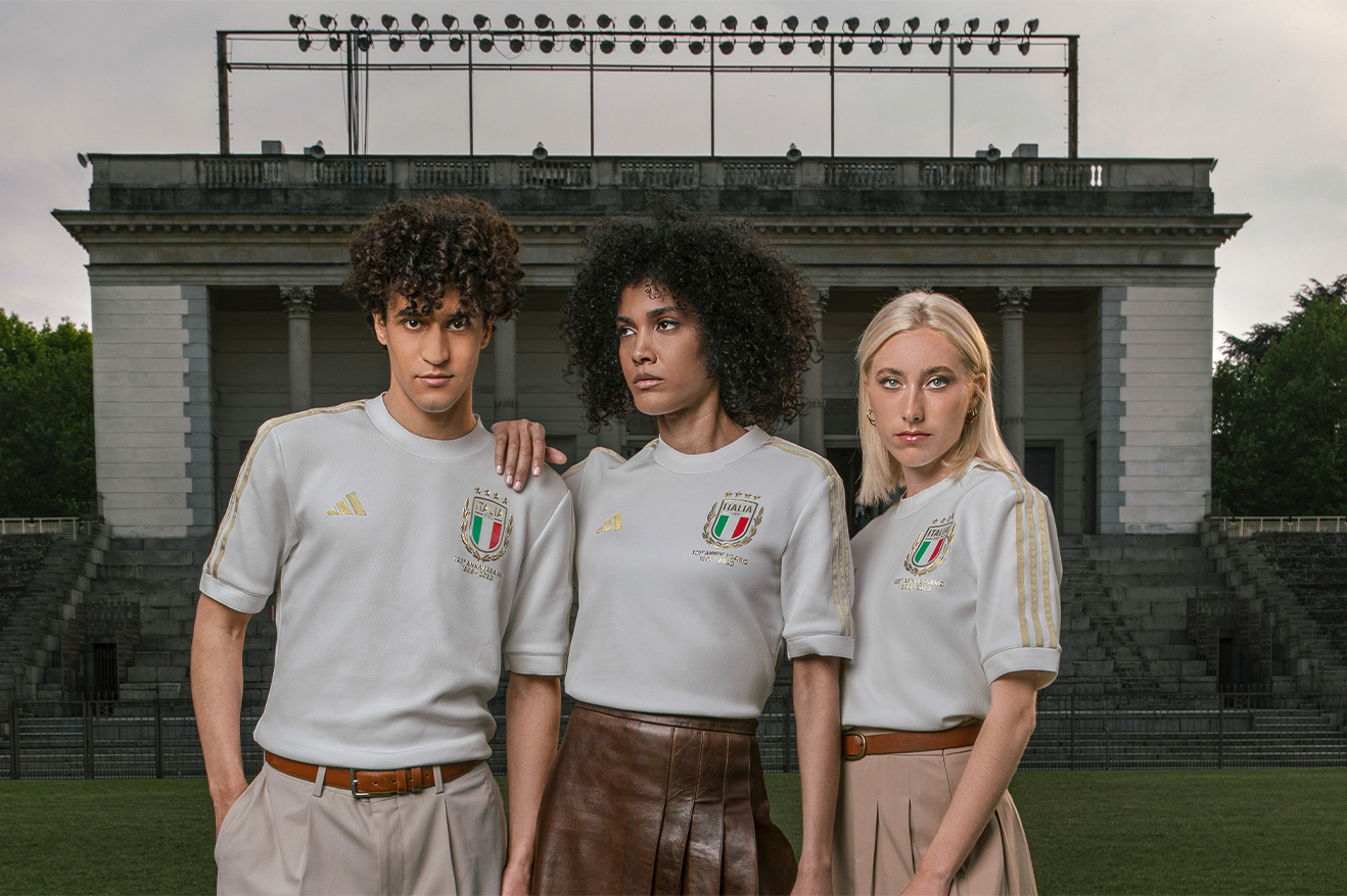 Bomullströjan har en vit bas med gyllene tre-streck längs axlarna och även en guldig adidas-logga. Italiens landslagssköld är omgiven av lagerkransar och jubileumssiffror, som inspireras av landets historia i Romarriket. Liknande detaljer pryder den nedre halvan av kitet, shortsen och strumporna, som kommer att visas upp under Nations League.
