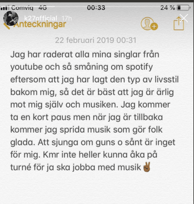 ”Jag har raderat alla mina singlar från YouTube och Spotify eftersom att jag har lagt den typ av livstil bakom mig, så det är bäst att jag är ärlig mot mig själv och musiken. Jag kommer ta en kort paus men när jag är tillbaka kommer jag sprida musik som gör folk glada. Att sjunga om guns och sånt är inget för mig. Kommer inte heller kunna åka på turné för jag ska jobba med musik”
