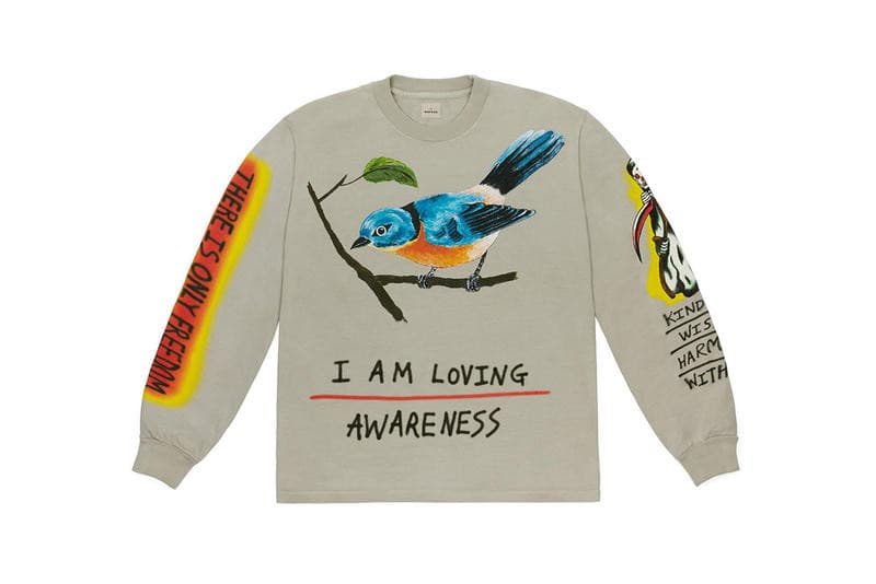 Duon har denna gång släppt tre långärmade T-shirt- tröjor som är täckta i handmålad grafik. Alternativen ”Wyoming” och ”Skeleton” kommer i en ljus ”Frozen Yellow”-färg. Och ”Bird”-tröjan i en gråtonad färg med en illustration av en blå fågel över frasen ”I AM LOVING AWARENESS”.