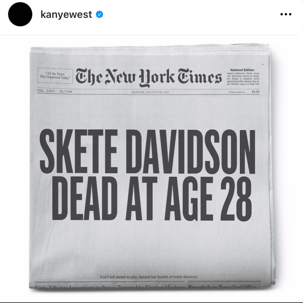 När Kim och Pete nu ryktas ha avslutat sitt förhållande verkar Kanye West fira … På Instagram delar han en, ganska osmaklig bild, med ett redigerat tidningsuppslag från The New York Times. På rubriken syns texten ”Skete Davidson Dead at Age 38”.