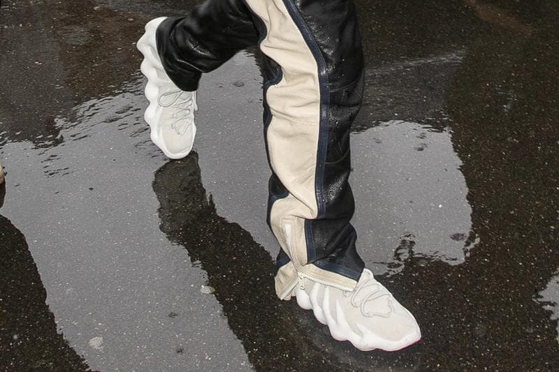 På bilderna ser vi honom bära en adidas YEEZY 451 i en ljus färgställning. Den osläppta skon har tidigare läckt i färgerna “white/blue,” “volt green/black” och “fuchsia/black” men här tycks Kanye ha på sig ”white/white”. Den futuristiska skon blir en utstickande YEEZY med hjälp av sin mesh-panel och bulkiga tand-liknande detaljer kring sulan.