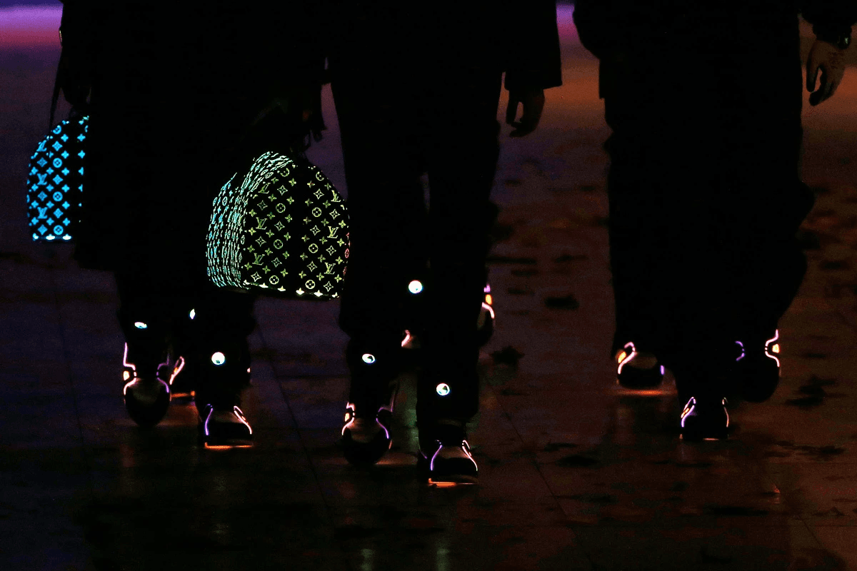 Virgil Abloh & Louis Vuitton avrundade showen med att släcka ner alla lampor och visa upp självlysande Louis Vuitton väskor och skor.