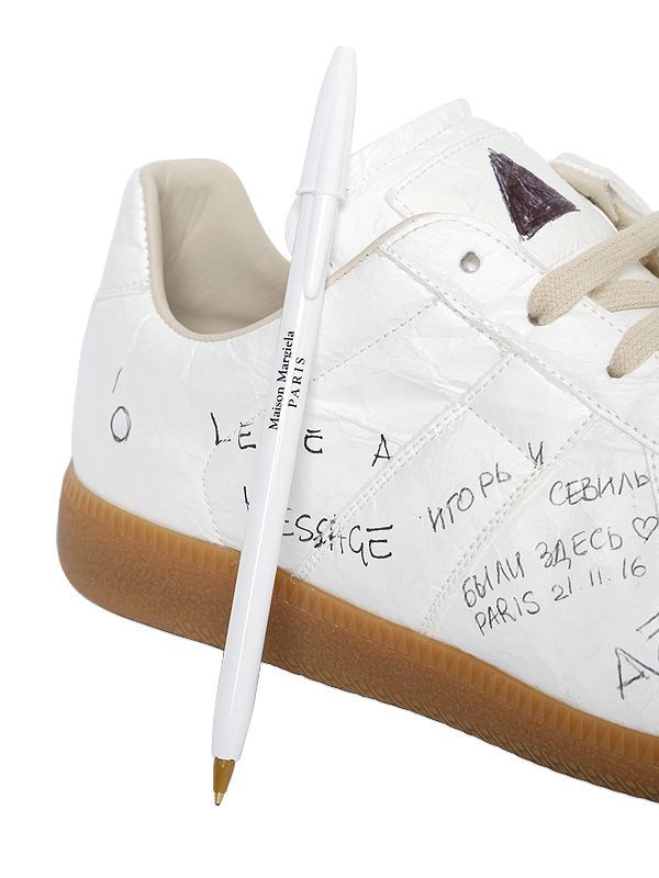Maison Martin Margiela släpper en ny version av sin populära 22 Replica low sneaker, även känd som armysneaker. Den nya modellen går under namnet ”Leave A Message” och det är just det köparen uppmannas att göra. Tanken är att man ska nyttja skons vita yta som en slags anslagstavla och rita eller skriva in ett meddelande. Tillskillnad från tidigare modeller som brukar vara i läder så är ”leave a message” gjord i polyester och polyeten med en ovansida i elastan.