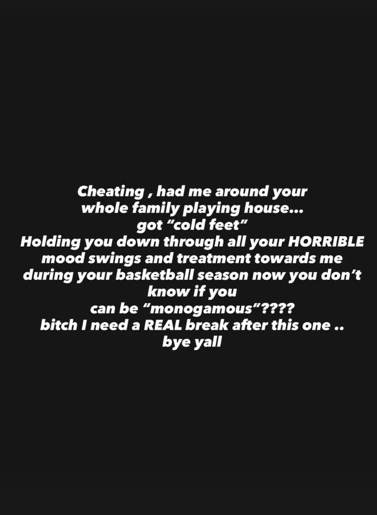 Hon skrev bland annat om hur hon stöttat honom genom tuffa perioder och humörsvängningar under basketsäsongen, bara för att han senare skulle tveka på om han överhuvudtaget kunde vara monogam.