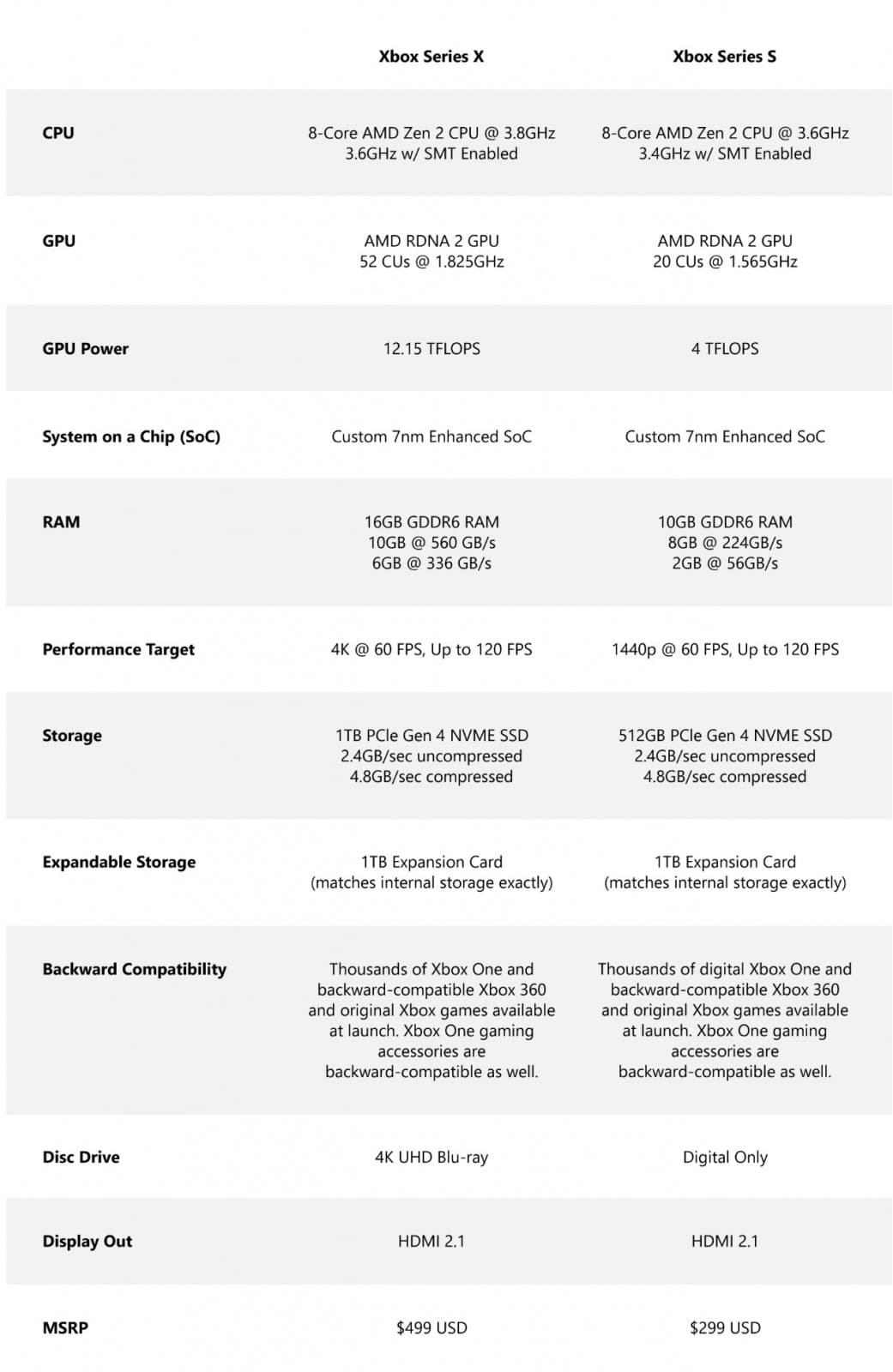 Xbox Series X är snabbare och har mer minne, den har tillskillnad från Series S även en fysisk diskläsare och kan spela 4K-spel. Idag avslöjade även Dolby att kommande Xbox Series X respektive Series S kommer bli de första i världen att få stöd för både Dolby Atmos och Dolby Vision HDR vid spel. Dolby Atmos 3D surround sound kommer vara tillgängligt direkt vid lansering, medan Dolby Vision HDR för spel kommer först 2021