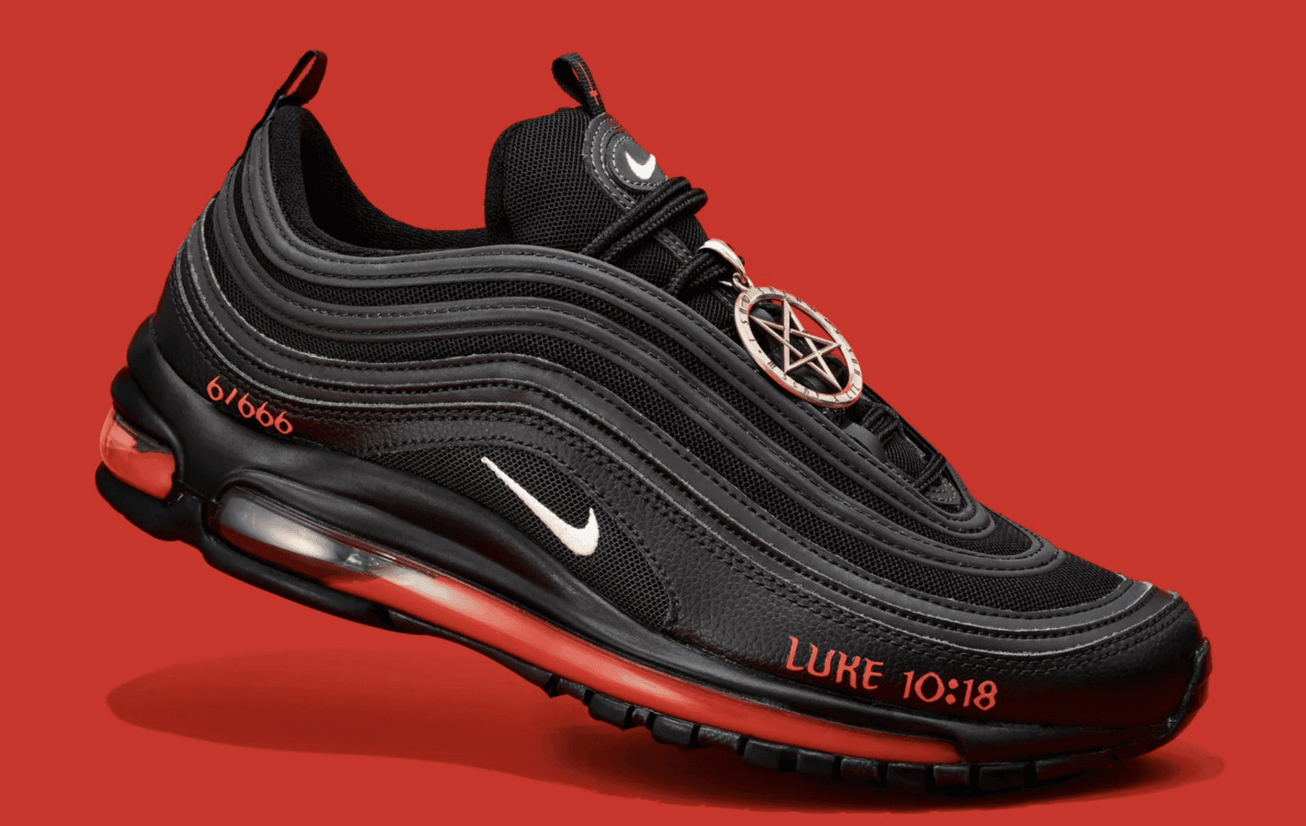 Artisten fortsatte det djävulska temat när han i helgen gick ut med att han hade ett kommande samarbete med NY-kollektivet MSCHF. Han visade då upp en specialdesignad Air Max 97 som han döpt till ”Satan Shoes”. De skulle komma i 666 par och designen anspelar på satanistiska teman som ett pentagram, och bibel versen Luke 10:18 som lyder: ”So he told them, ’I saw Satan fall like lightning from heaven”. Men det mest omtalade måste dock vara att skon ryktades innehålla ”60cc ink and one drop of human blood”. Det är nämligen sulan som ska innehålla såväl röd färg som en droppe människoblod. Blodet ska komma från medlemmar av kollektivet MSCHF.