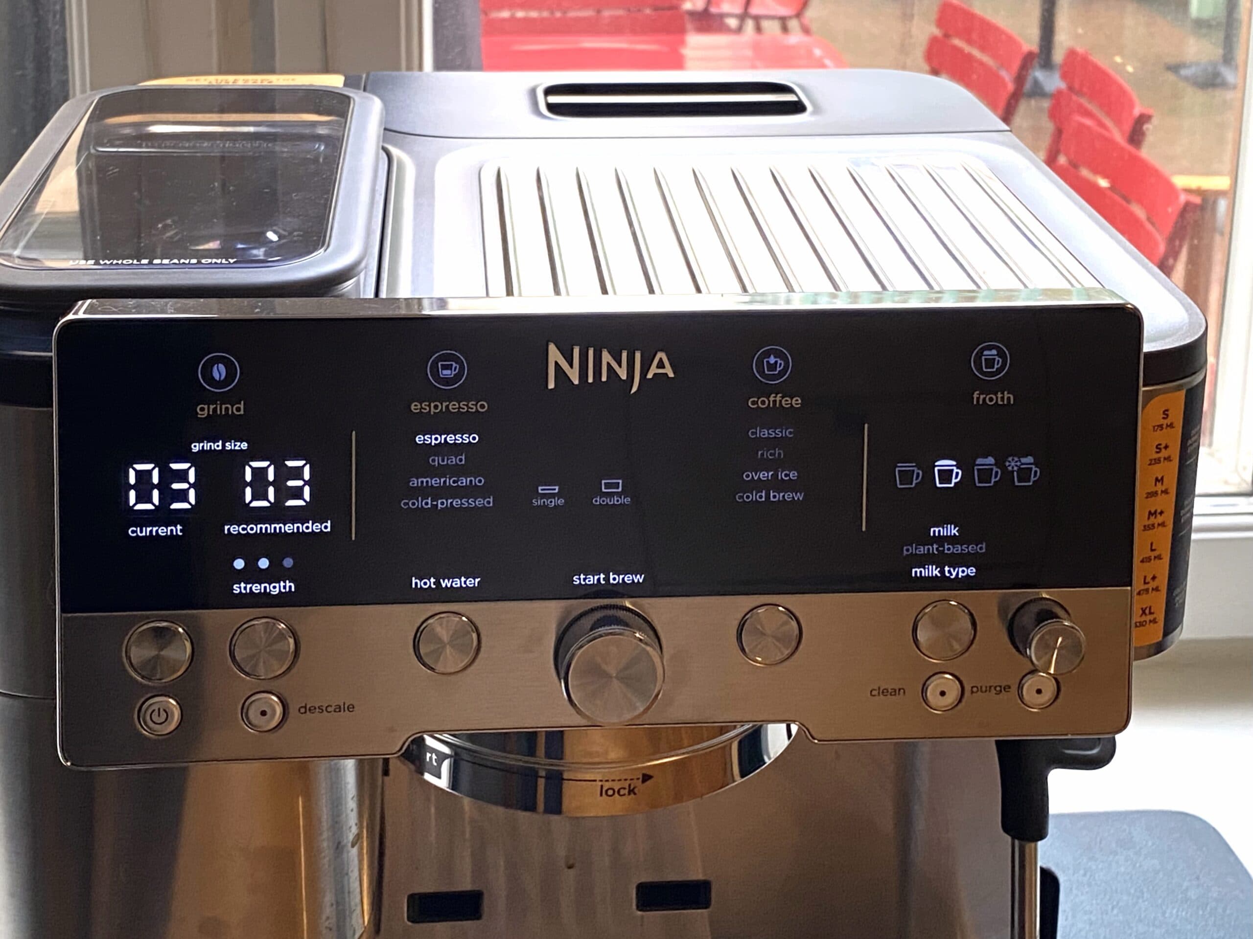 Direkt ur lådan känns Luxe Café mer premium än tidigare Ninja-maskiner. Den är tung på ett positivt sätt, stadig i rostfritt stål och har en industriell, stilren look som passar in i mer eller mindre alla kök eller i vårt fall: kontoret. Maskinen är stor och tar plats på bänken, den väger 11,7 kg men med tanke på att den ersätter tre maskiner är det fullt acceptabelt.