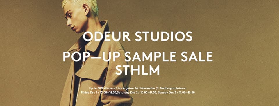 Stockholmsbaserade varumärket Odeur som gjort sig kända för sin unisex-plagg och användandet av en ren och lätt doft på alla deras plagg (därav namnet) istället för att ha en visuell logotype bjuder in till utförsäljning i Stockholm kommande helg. På utförsäljningen så kommer man att kunna köpa Samples och tidigare Odeur plagg till 50-80% rabatt.