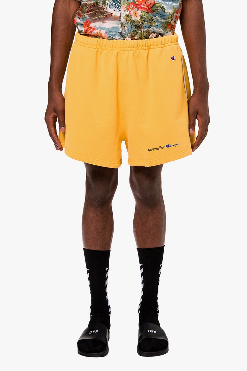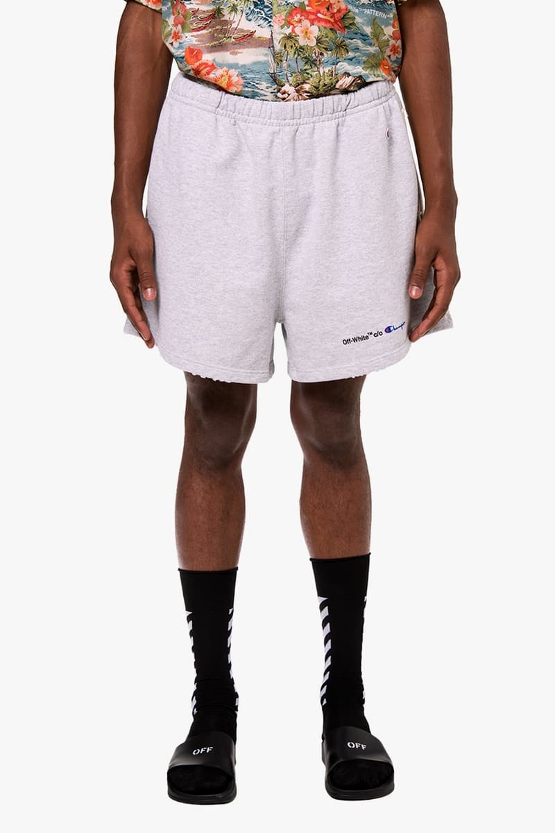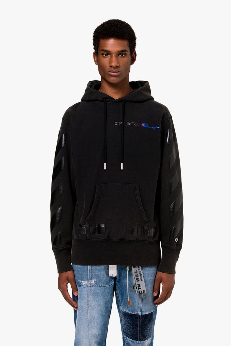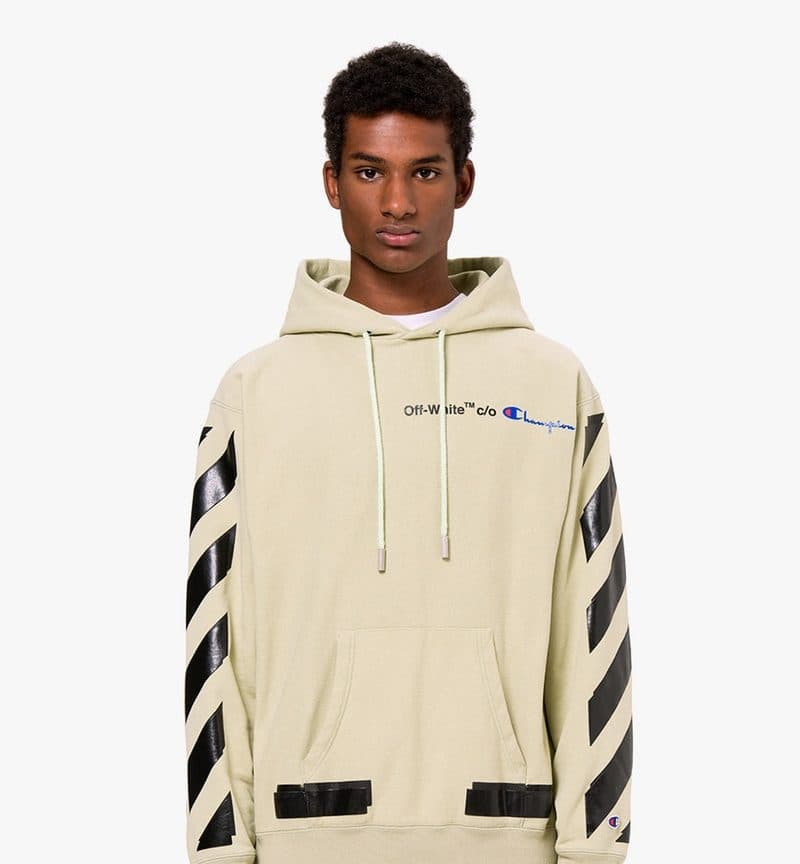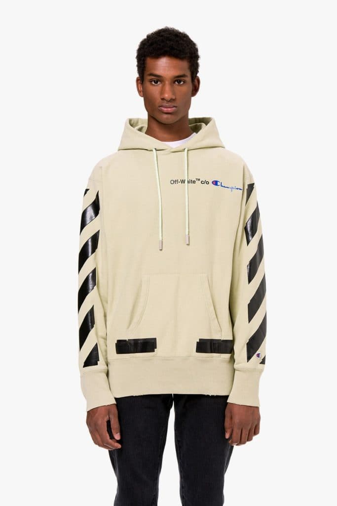 Off-White x Champion kollektionen består av 16 plagg därvi bland annat se hoodies, tröjor, t-shirts, mjukisbyxor och shorts. På plaggen ser vi Off-Whites signatur-ränder samt Off-White och Champion loggan broderat på plaggen.