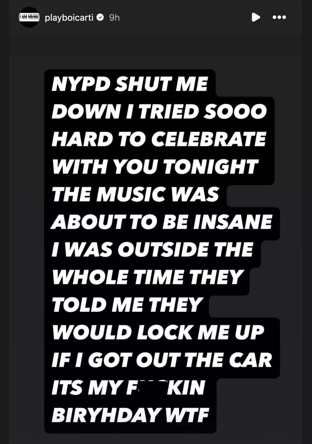 Carti själv tog till Instagram efter nedstängningen och berättade att han satt i sin bil i närheten när han såg kaoset utbryta. Polisen ska enligt rapparen ha själv ha hotat med arrest om han lämnade sin bil.