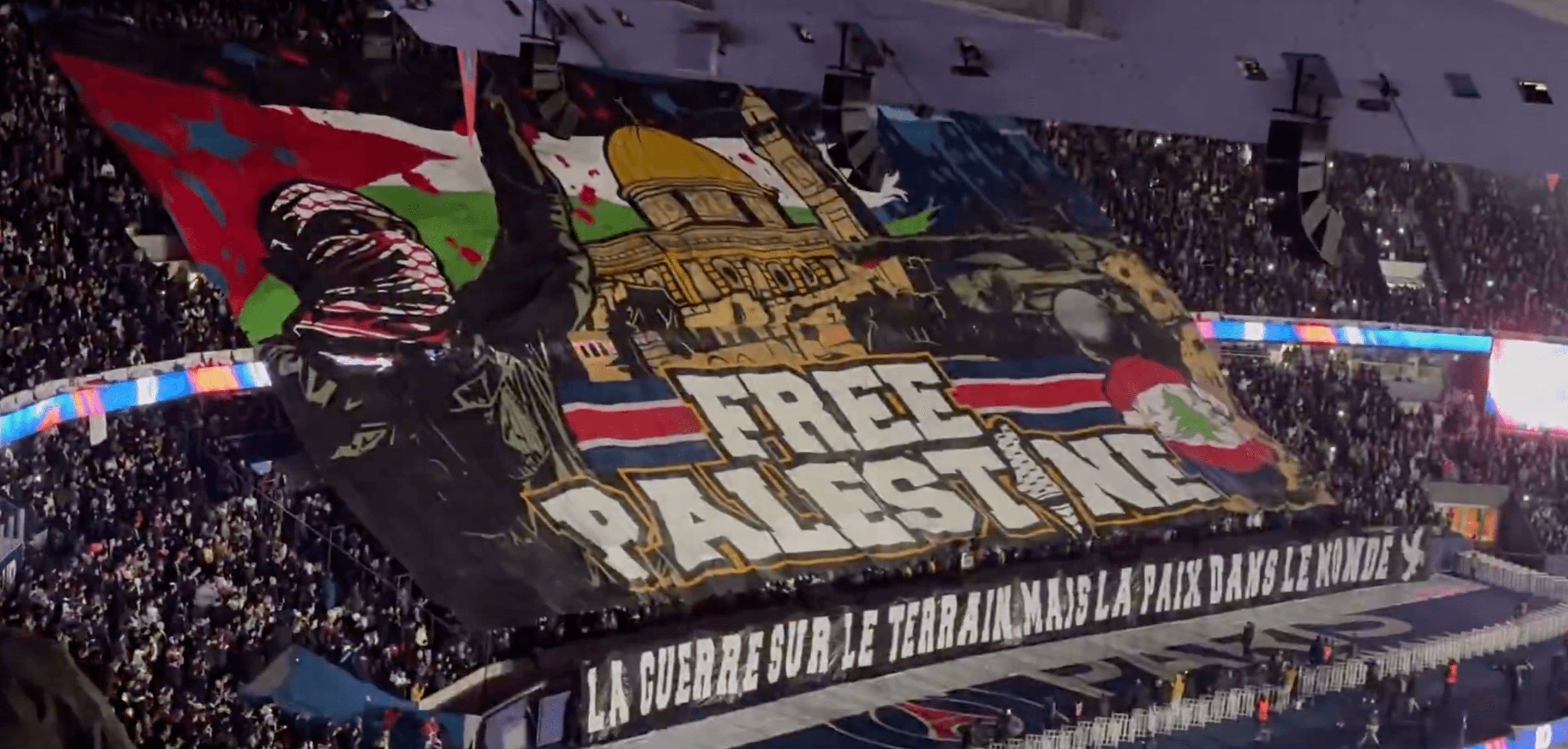 Inför matchen rullade de nämligen ut ett enorm tifo över ena kortsidan, där klubbens mest hängivna ultras står. ”Fria Palestina. Krig på planen men fred i världen” löd budskapet under en illustration som blandade Palestinska motiv med PSG:s färger och även den libanesiska flaggan.