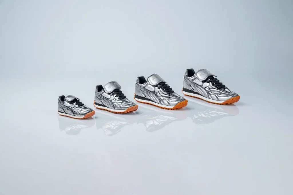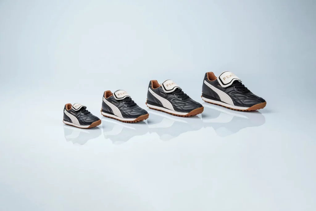 Den nya skon är en hybridmodell som kombinerar Pumas fotbollssko ”King”, använd av Pelé, med löparskon ”Easy Rider”. Den har en ovandel i vintage-tonat läder, en vikbar tunga och gummisula i den där ikoniska ”gummi-orange” färgen som klassiska gympaskor har.