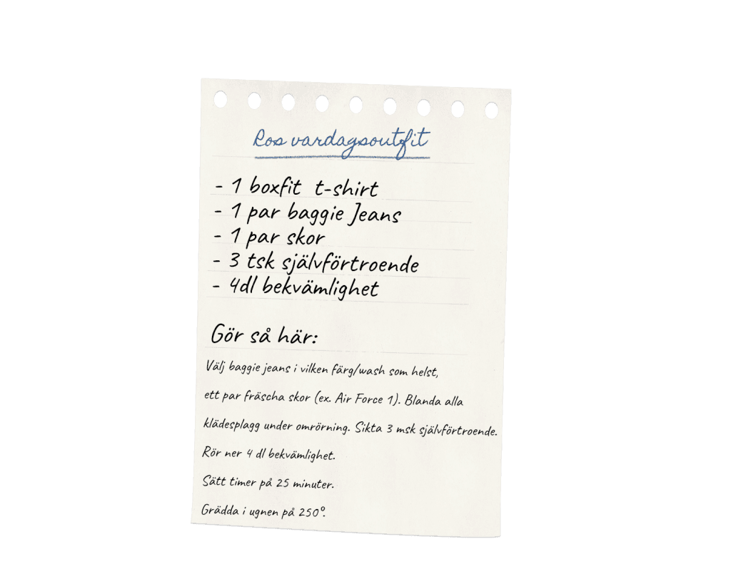 Mat, musik och mode – är de tre heliga M:en i Ros liv. Så varför inte kombinera dessa? Ovan hittar du Ros recept på “Den perfekta vardagsoutfiten”. Det viktigaste när det kommer till att skapa en perfekt outfit är, enligt Ros, att alltid vara sig själv och bära kläder man känner sig bekväm i. Den som följer artistens Instagram-profil vet att hon har ett stort modeintresse. Ros berättar att hon: “[…] gillar att sticka ut och när folk stannar upp och ser en. Men den situationen kan också vara det värsta som finns. När någon tittar och man inte känner sig bekväm. Därav är det alltid viktigt att man själv är bekväm med det man har på sig. Det är det enda som räknas!”