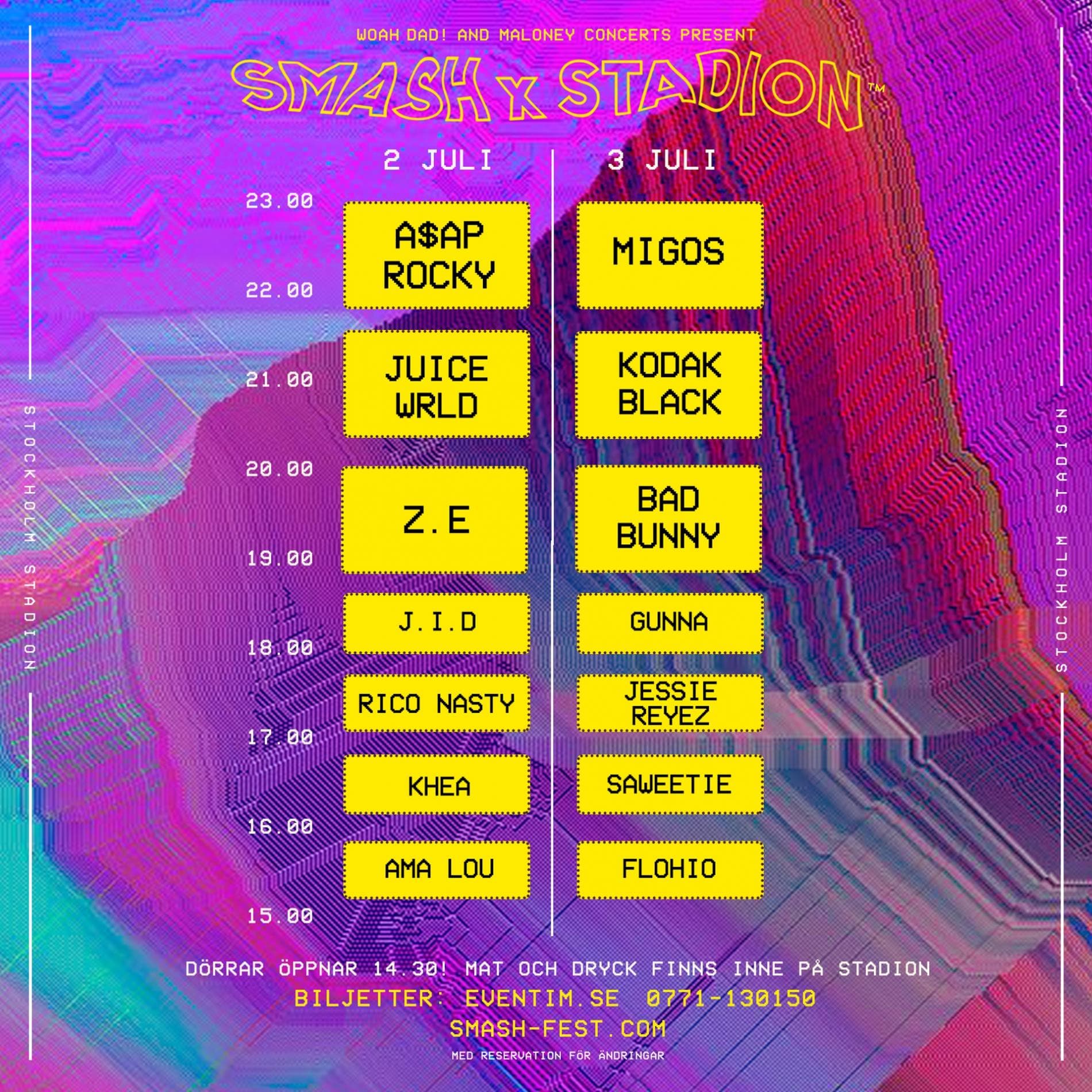 Spana in hela spelschemat för Smash x Stadion nedan! Ingen av artisterna spelar inte samtidigt, vilket gör att publiken kan få uppleva alla utan att missa någon!