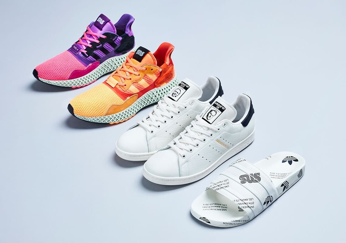 Bland dessa produkter får vi se två par ZX4000 4D i färgerna ”Sunrise” och ”Sunset”, en referens till Los Angeles ofta vackra soluppgång samt solnedgång. Vi får också se ett par adilette sandaler där adressen på den nyaste SNS-butiken står inskriven även det en LA referens. Jubileumspacket rundas av med ett par klassiska Stan Smith som kommer med ”Sneakersnstuff” stämplat i guld och ett porträtt på grundarna Peter Jansson och Erik Fagerlind på plösen.
