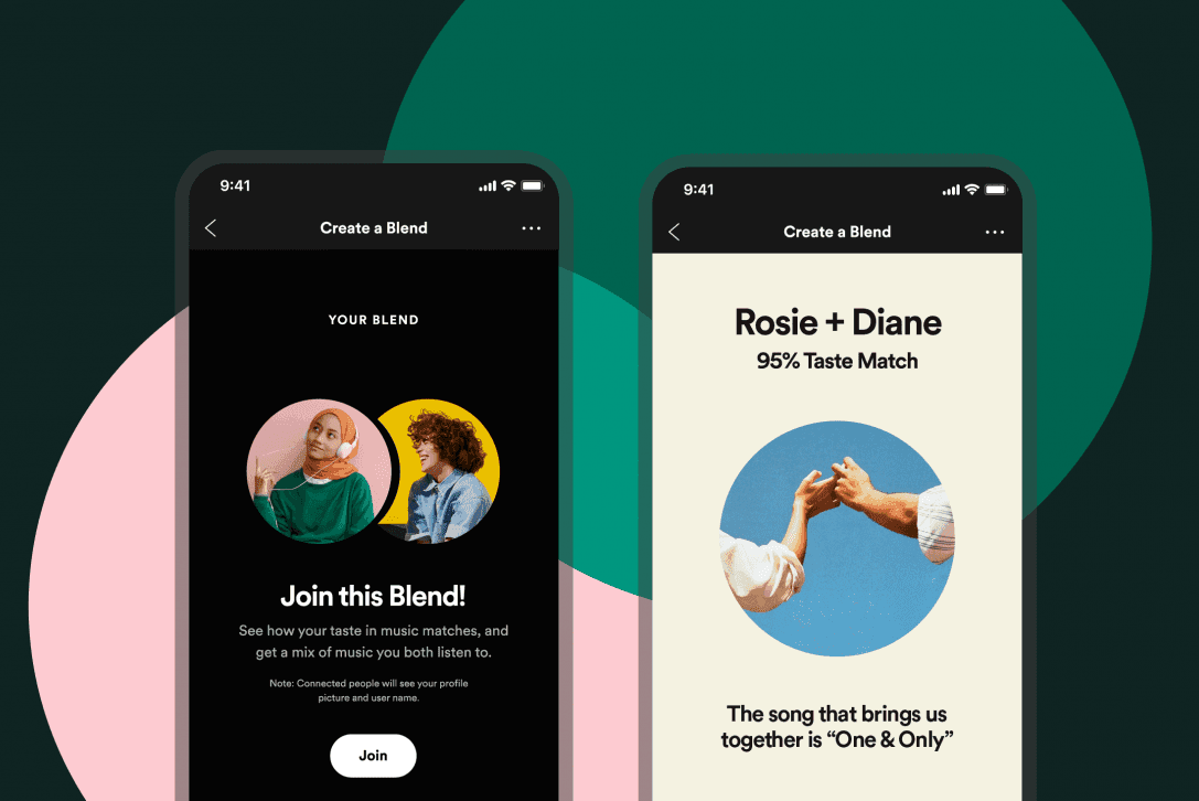 - Blend: När din vän har accepterat din inbjudan skapar Spotify ett unikt omslag och en kurerad spellista för er två, fylld med låtar baserade på era kombinerade musiksmaker och lyssningsvanor. För premiumanvändare finns även möjligheten att se vilken låt som adderats utifrån vems musiksmak.
