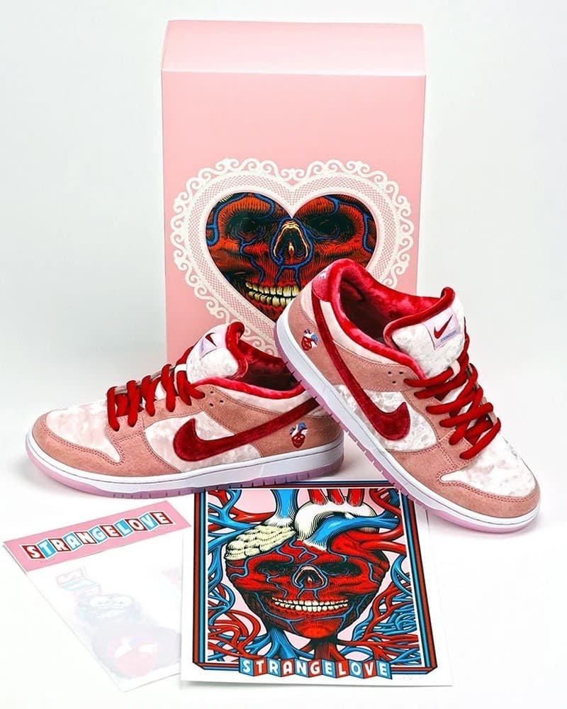Skorna som släpps är modellen Nike Dunk Low i en rosa och röd färgkombination. Skon är klädd i sammet och på hälen så finns StrangeLove’s klassiska motiv föreställande en röd dödskalle. Som detalj under sulan finns det även små hjärtan som knyter sig till Alla hjärtans dag-temat.