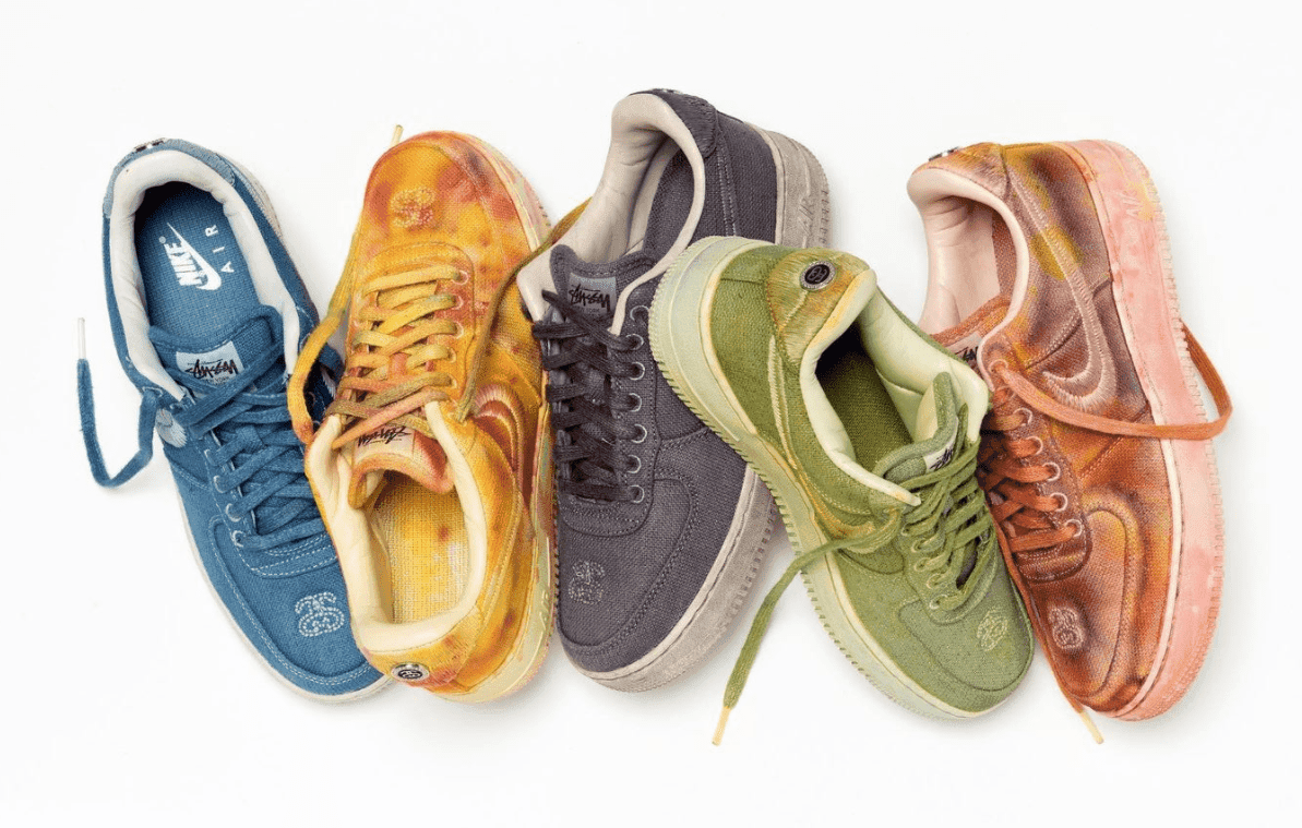 I samband med klädsläppet kommer återigen en Stüssy x Nike Air Force 1. Den här gången är skon handfärgad med växtbaserade färger – i fem olika nyanser. De olika tonerna representerar Stüssy’s World Tour-städer: London (grön), Paris (lila), Los Angeles (gul), New York (röd), Tokyo (blå).