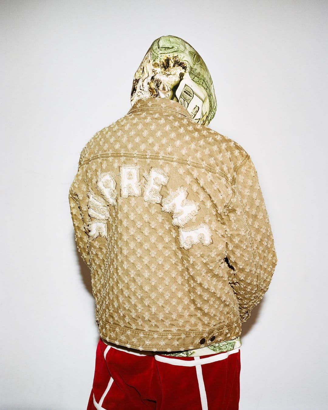 Det mest utstickande blir den guldfärgade trucker-jackan, med ”SUPREME” branding tryckt över ryggen, samt med råa detaljer i vitt längs med jackans grund. Under jackan syns en hoodie, zip eller vanlig, i ett grönt print bestående av den amerikanska $20-dollarn. Som nederdel syns färgstarka byxor i röd palett med vita linjer.