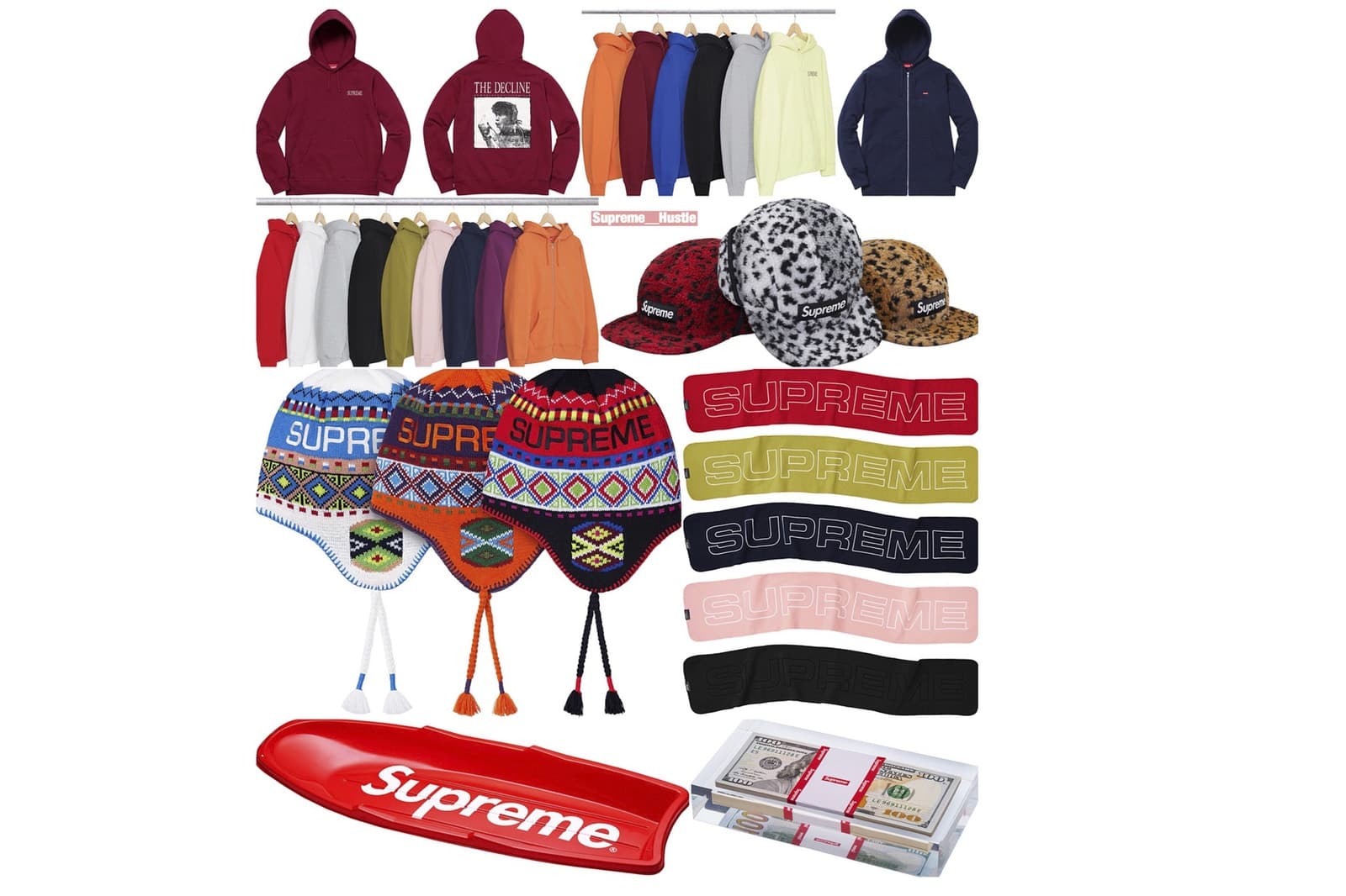 Utöver pulkan kommer Supreme enligt Supreme Leaks att släppa pappersvikt med de inglasade 100-dollar sedlarna som ryktades släppas redan förra veckan samt ett par hoodies med ”The Declines” tryckt på ryggen, leopardmönstrade kepsar och mössor. Se plaggen som släpps nedan.